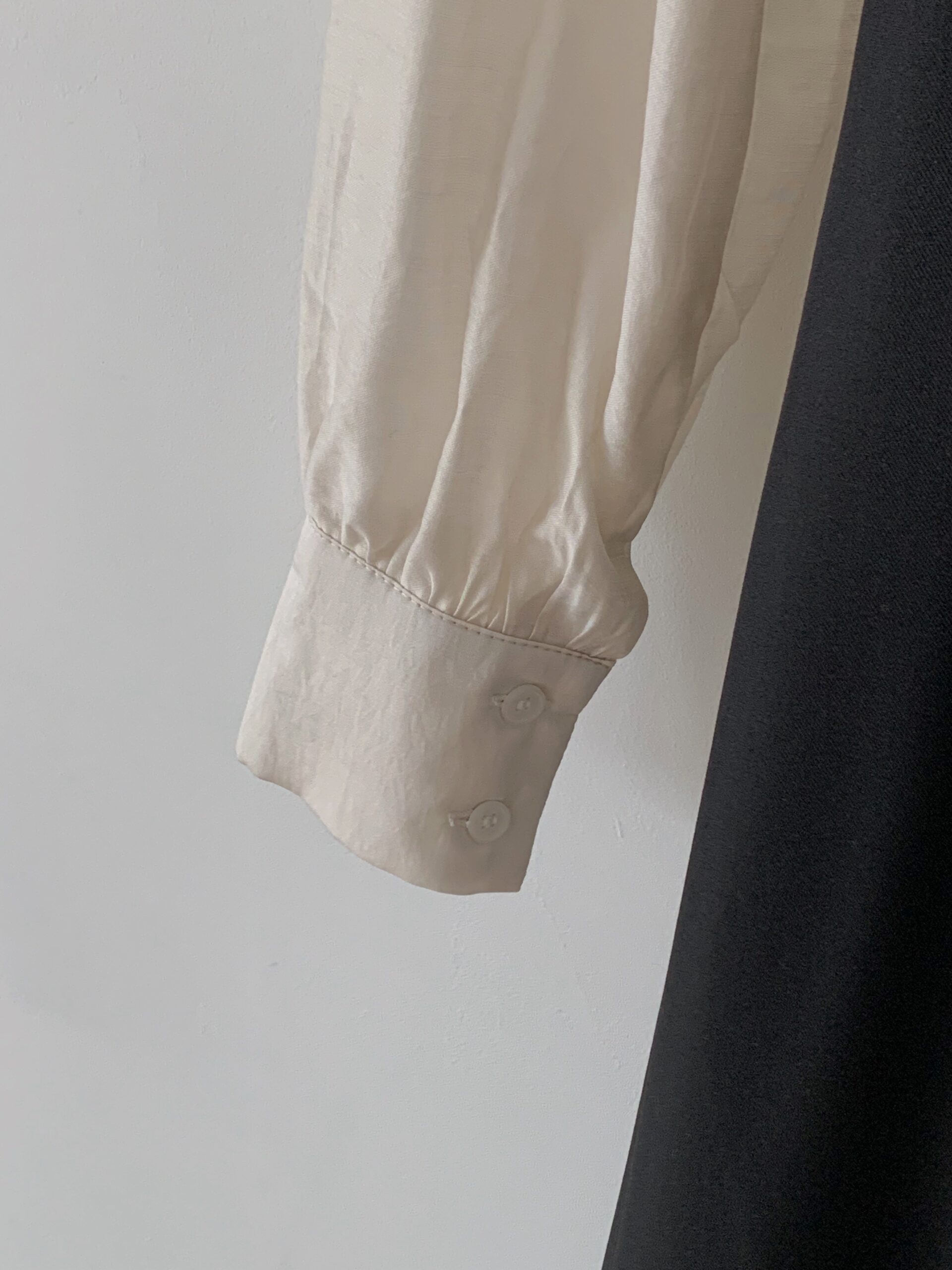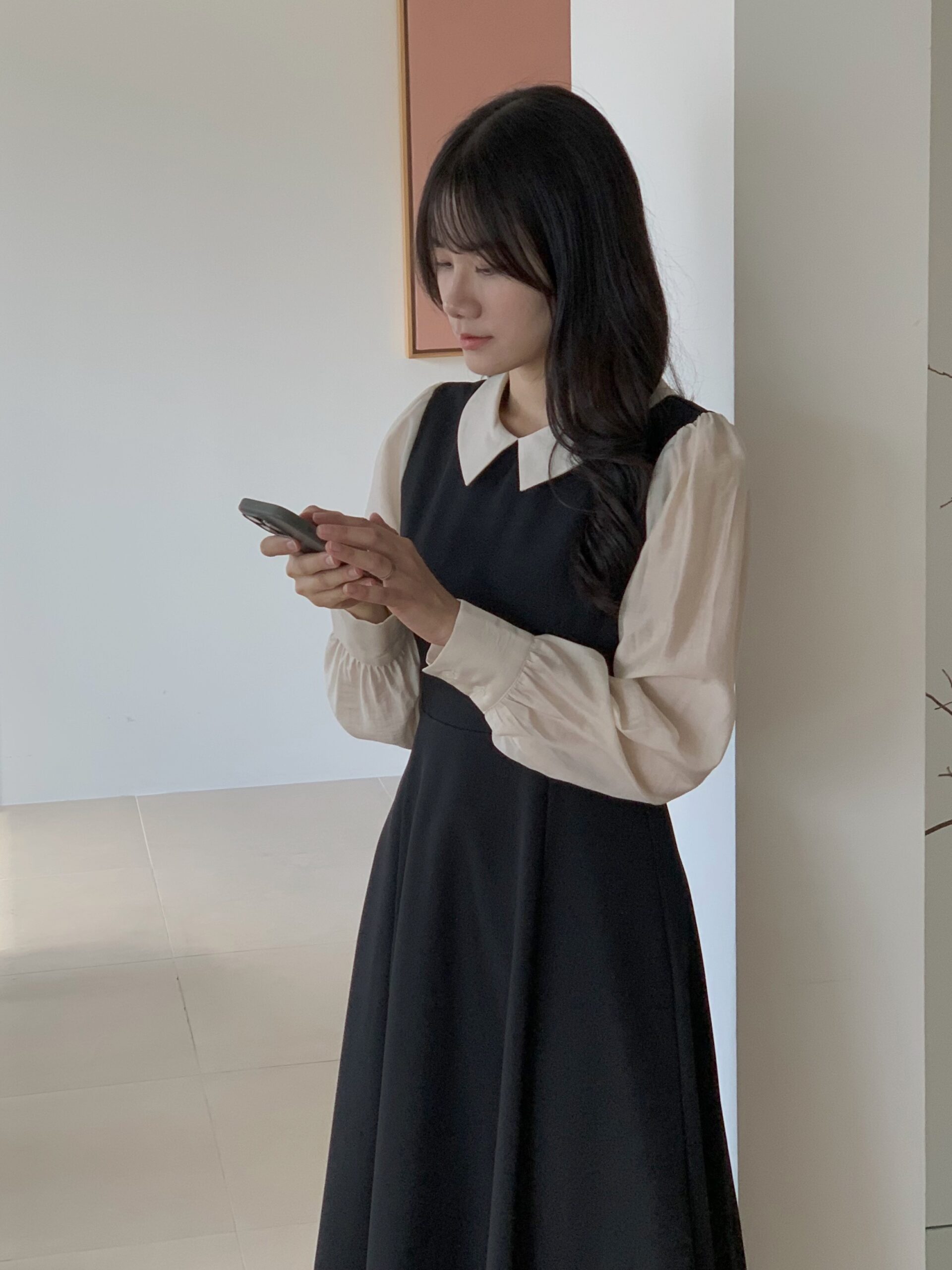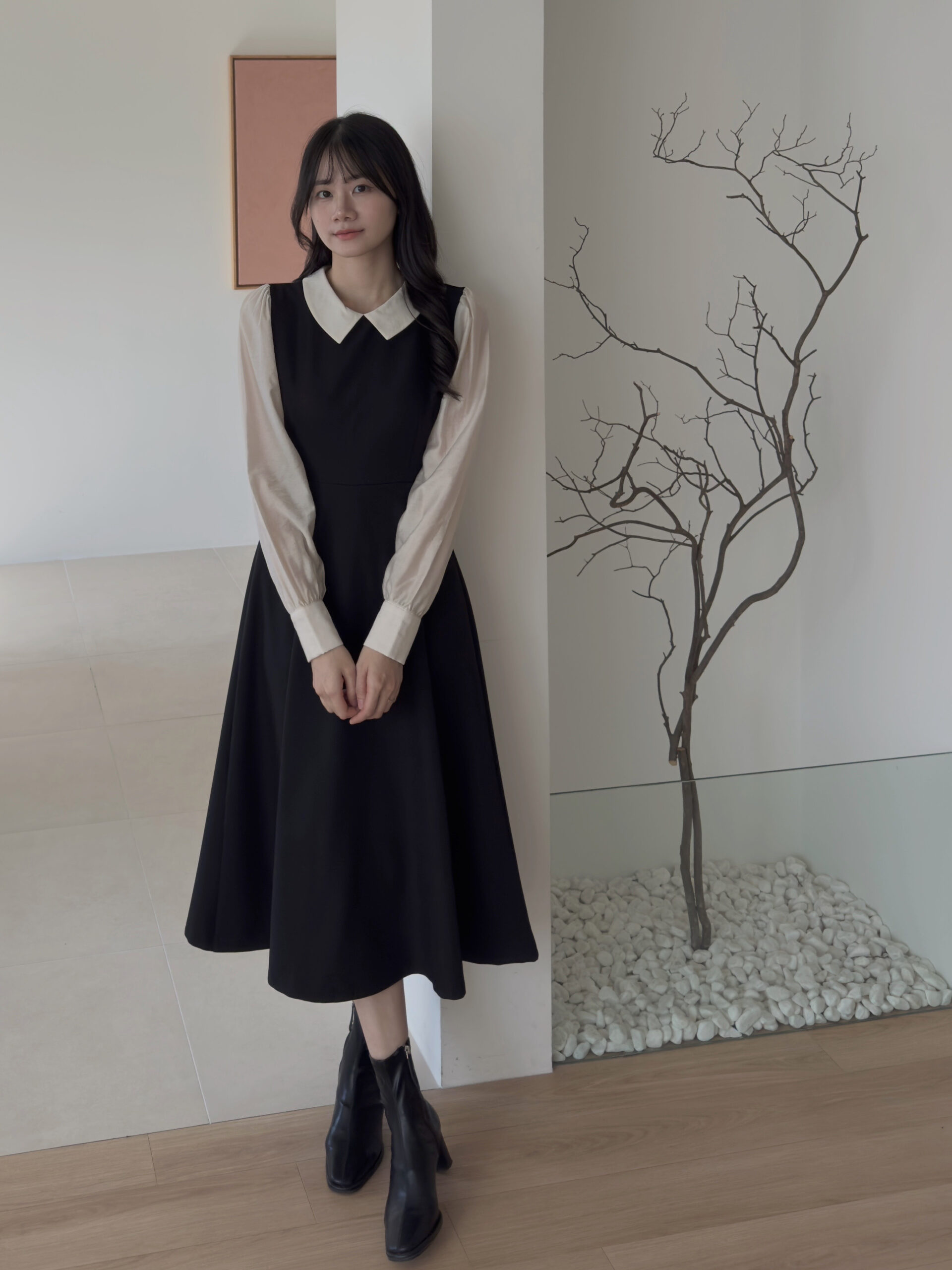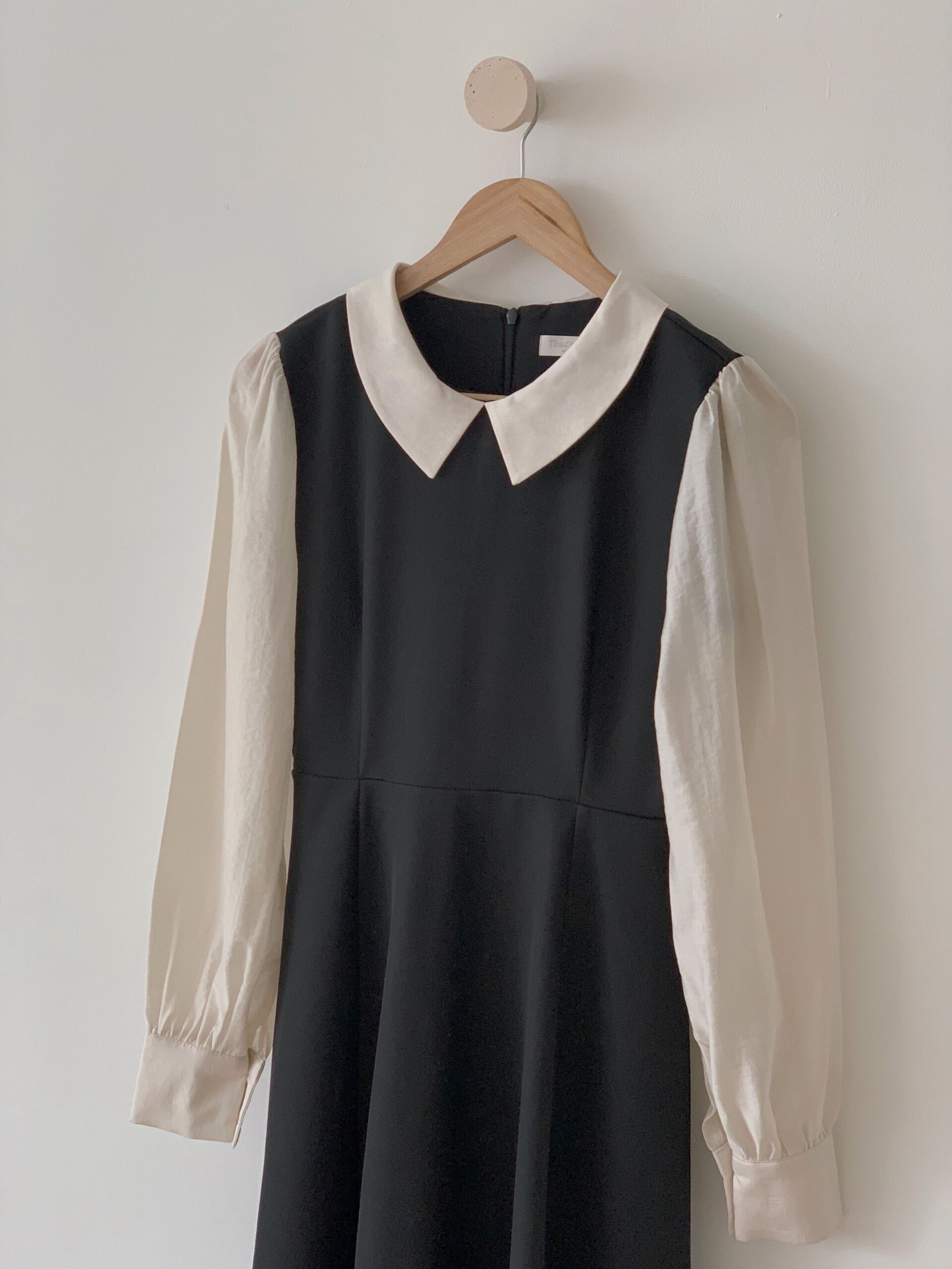 最喜歡的是 拼接雪紡長袖+白色領片,氣質感滿分,帶一點復古學院風,又不會太過甜美,剛剛好。袖子的蓬度讓手臂看起來更細,整件穿起來優雅但不浮誇,非常耐看。