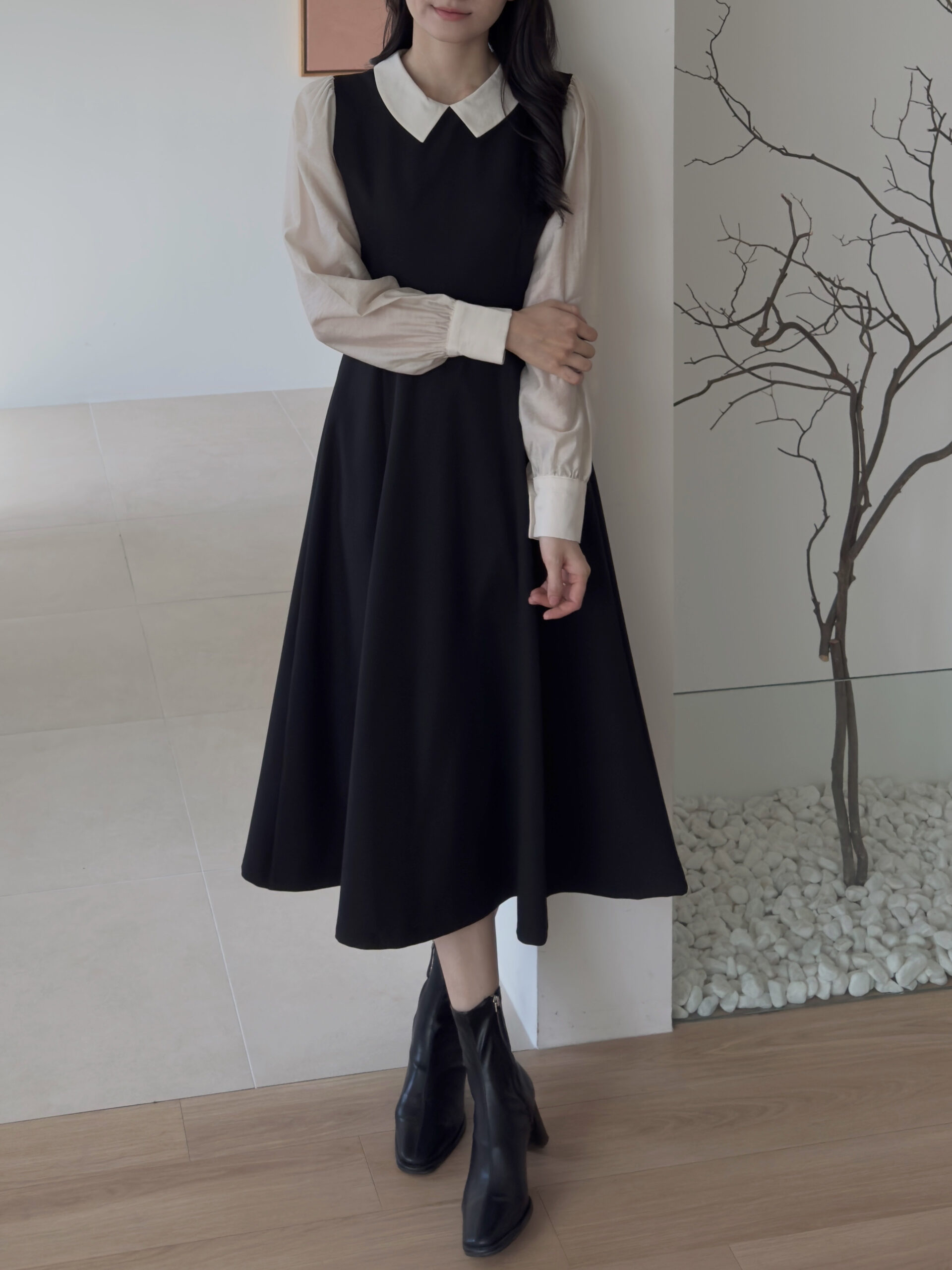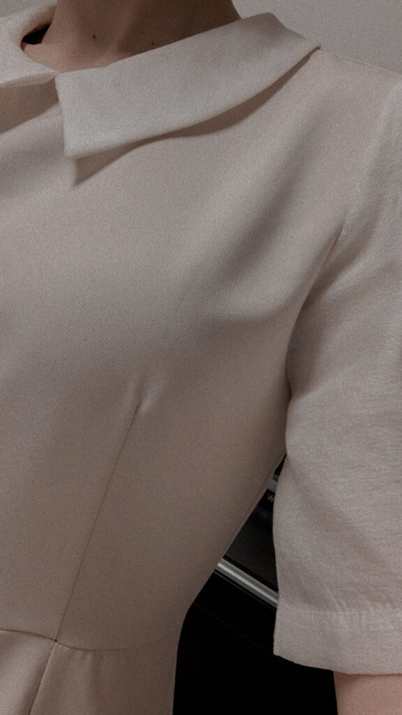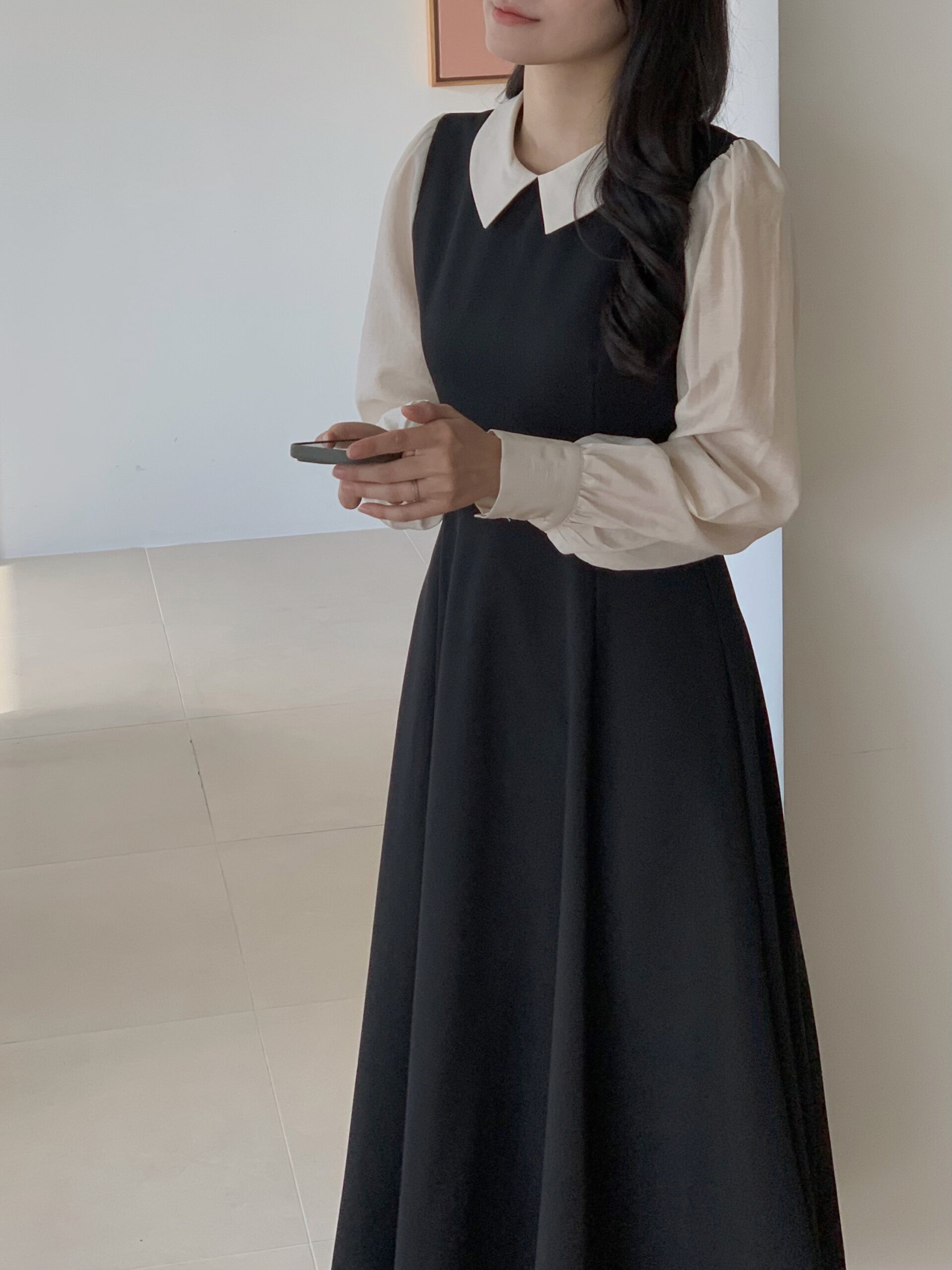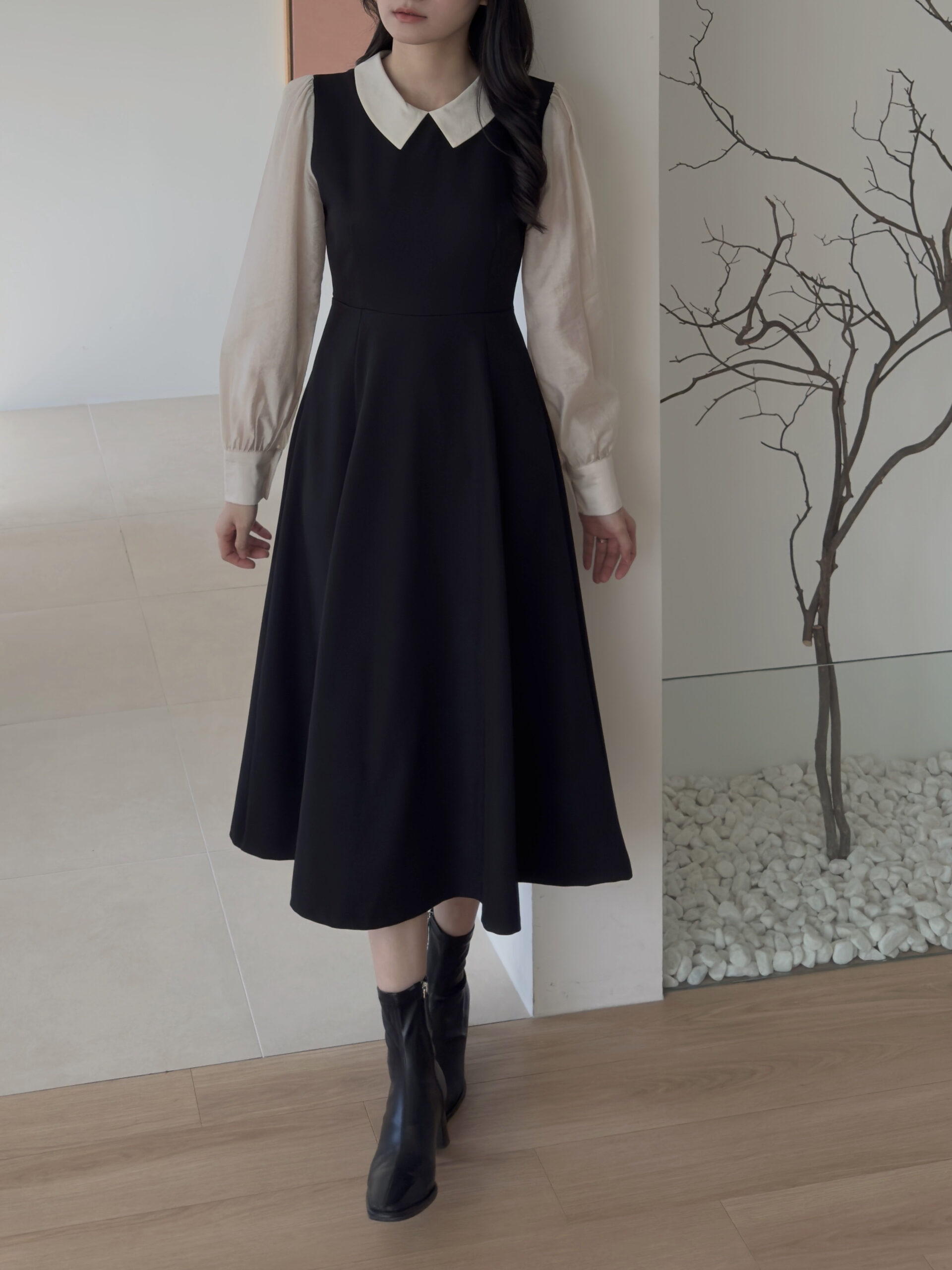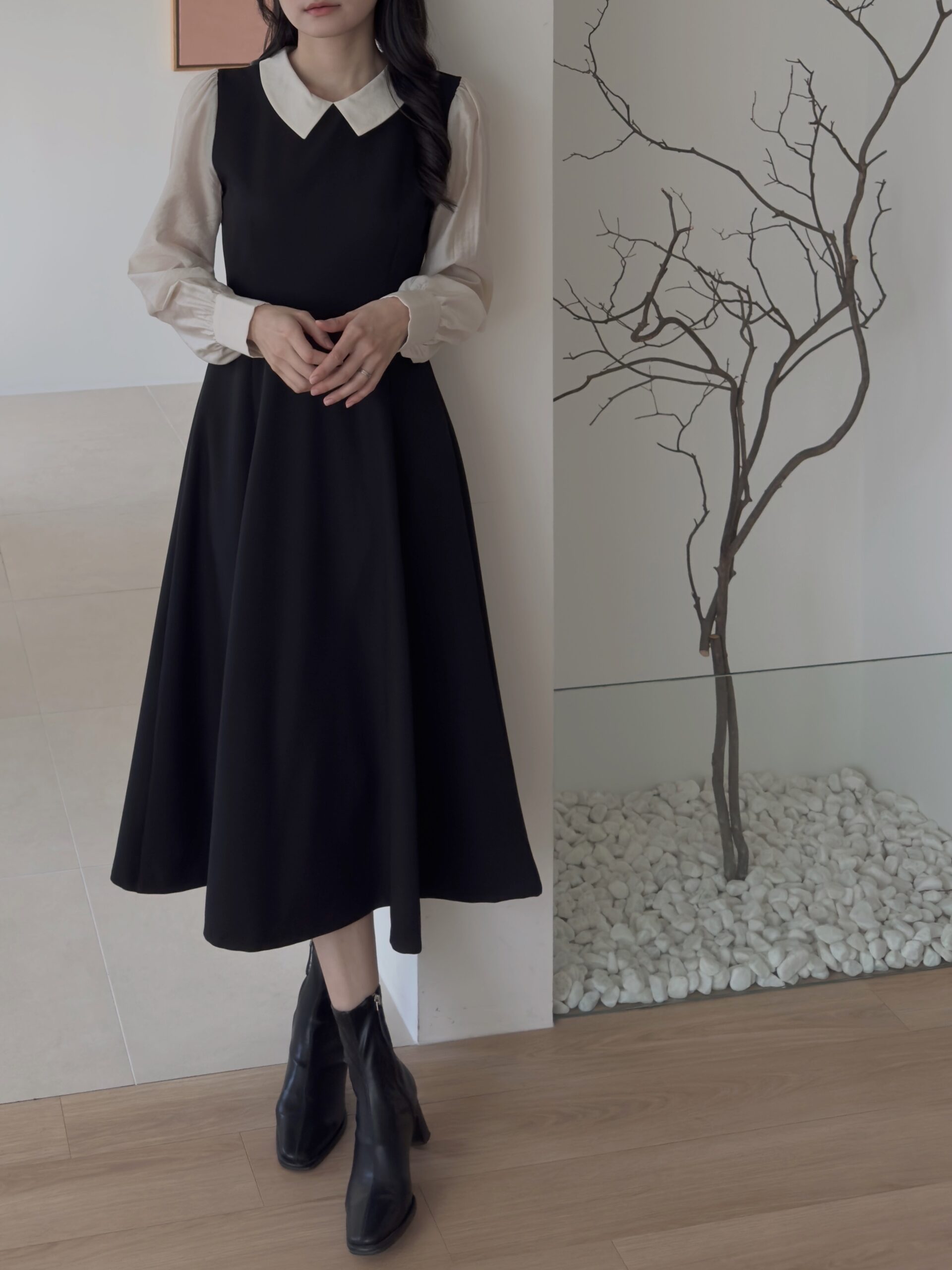 最喜歡的是 拼接雪紡長袖+白色領片,氣質感滿分,帶一點復古學院風,又不會太過甜美,剛剛好。袖子的蓬度讓手臂看起來更細,整件穿起來優雅但不浮誇,非常耐看。