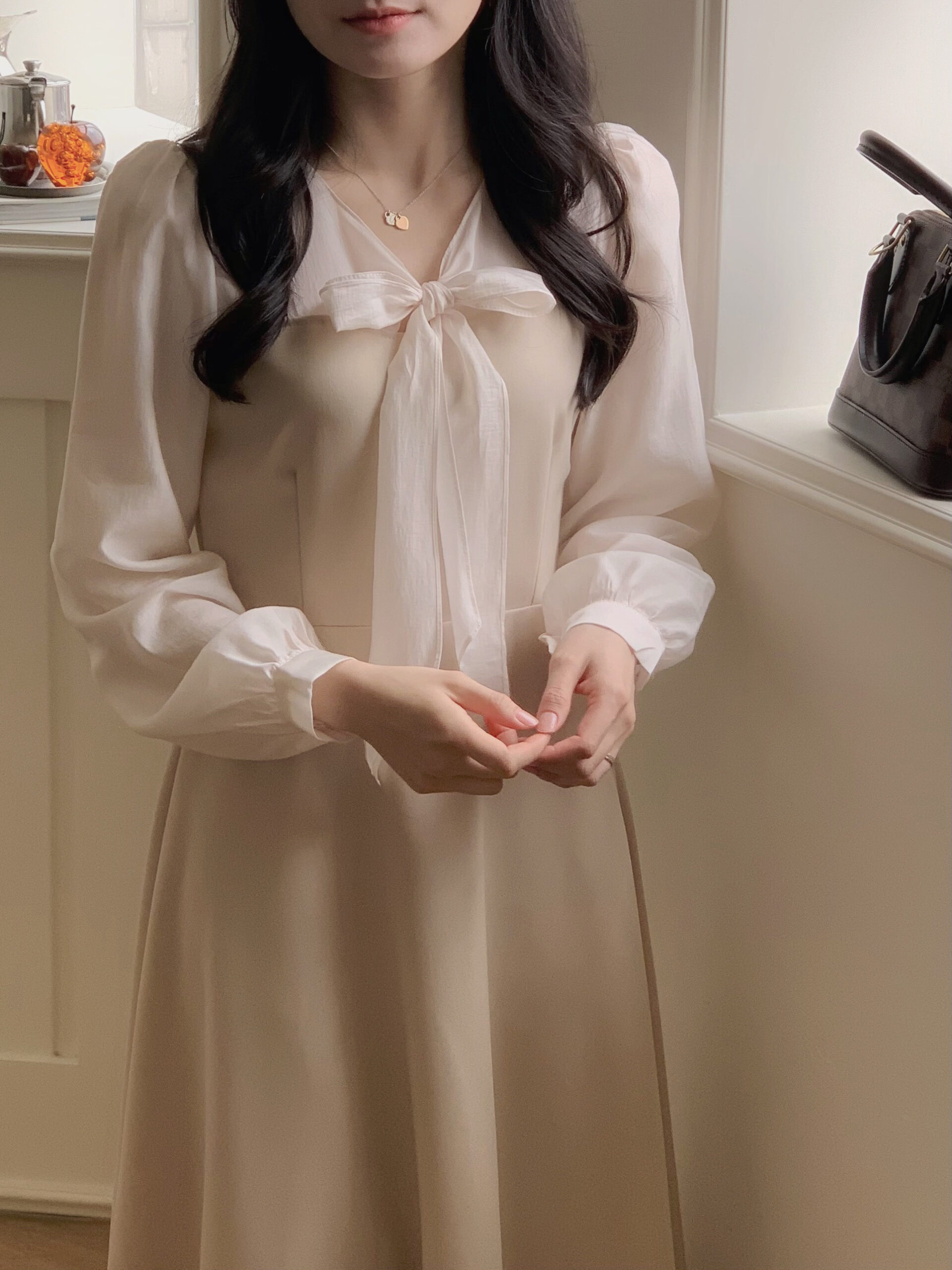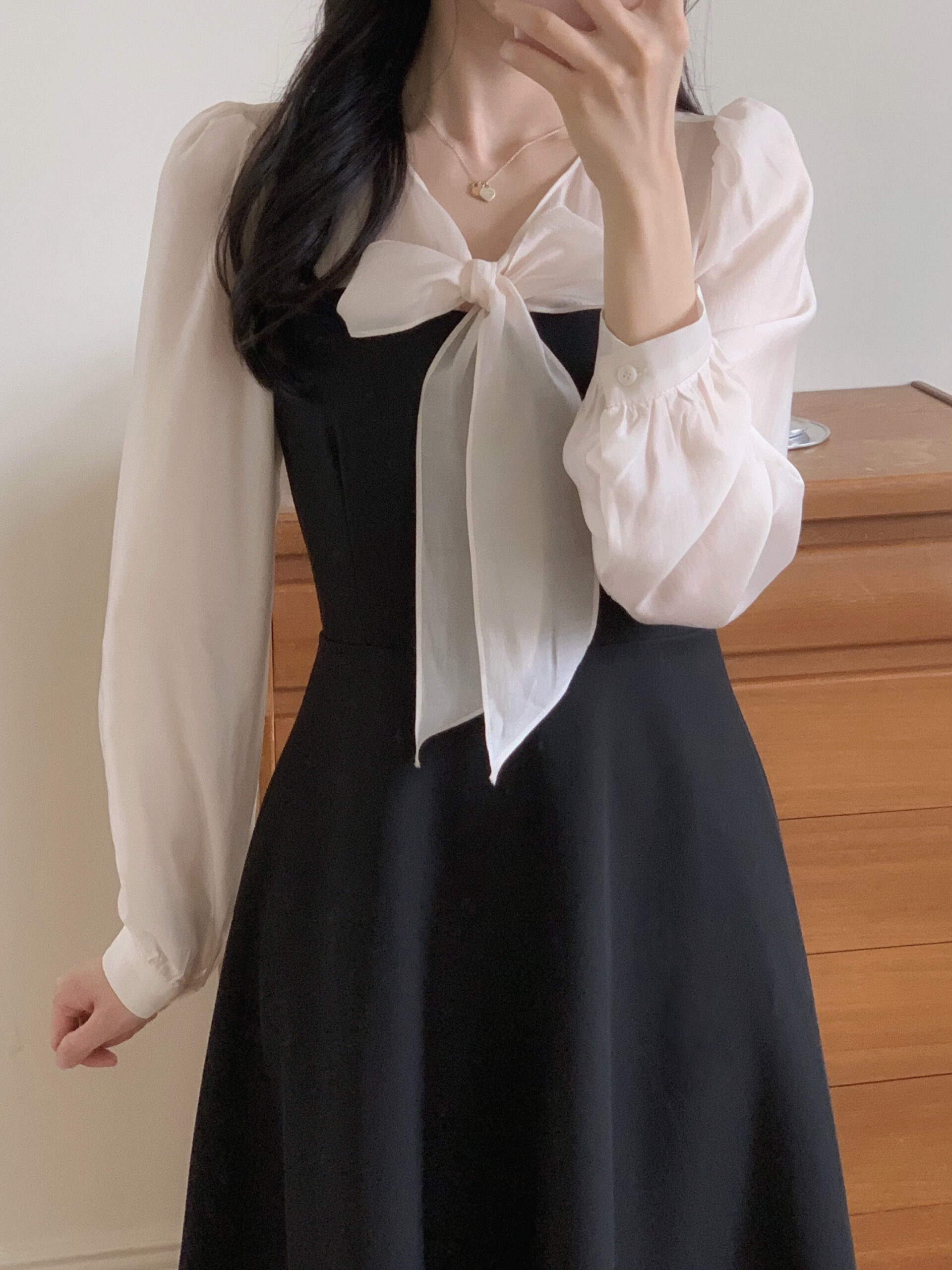 貼身的範圍是從胸口到小腹,材質整體完全不會刺,袖口是不會刺的雪紡,其他部位挺版但不會太厚,穿著整體是很好看很有氣質的感覺🫶🏻🫶🏻