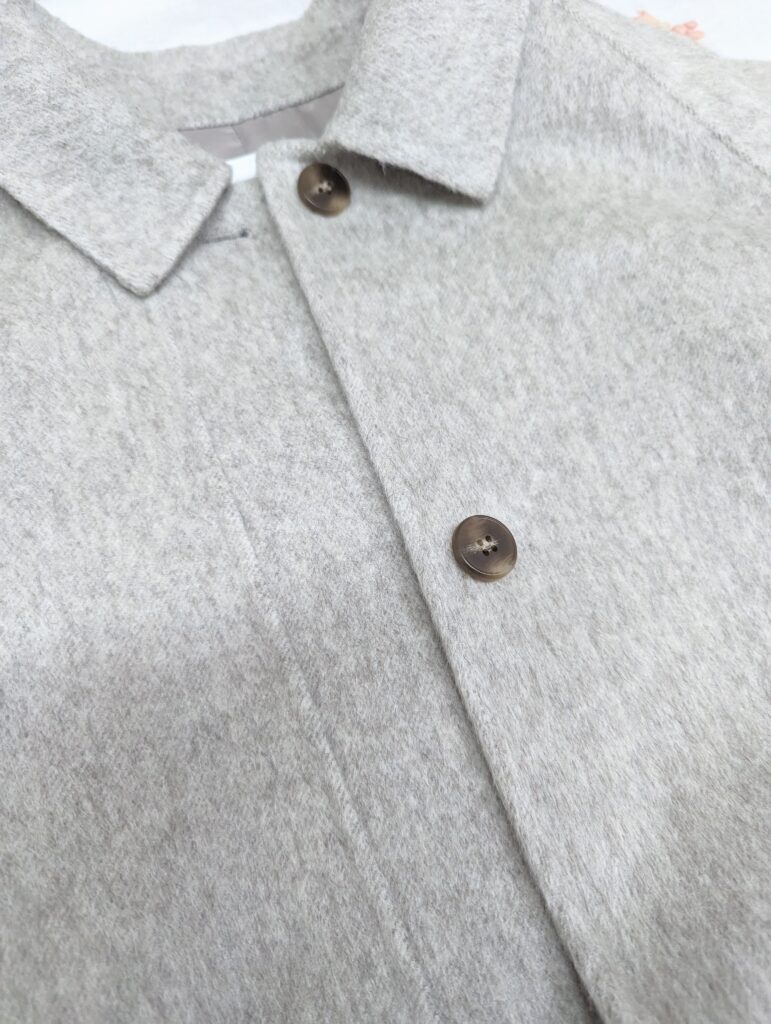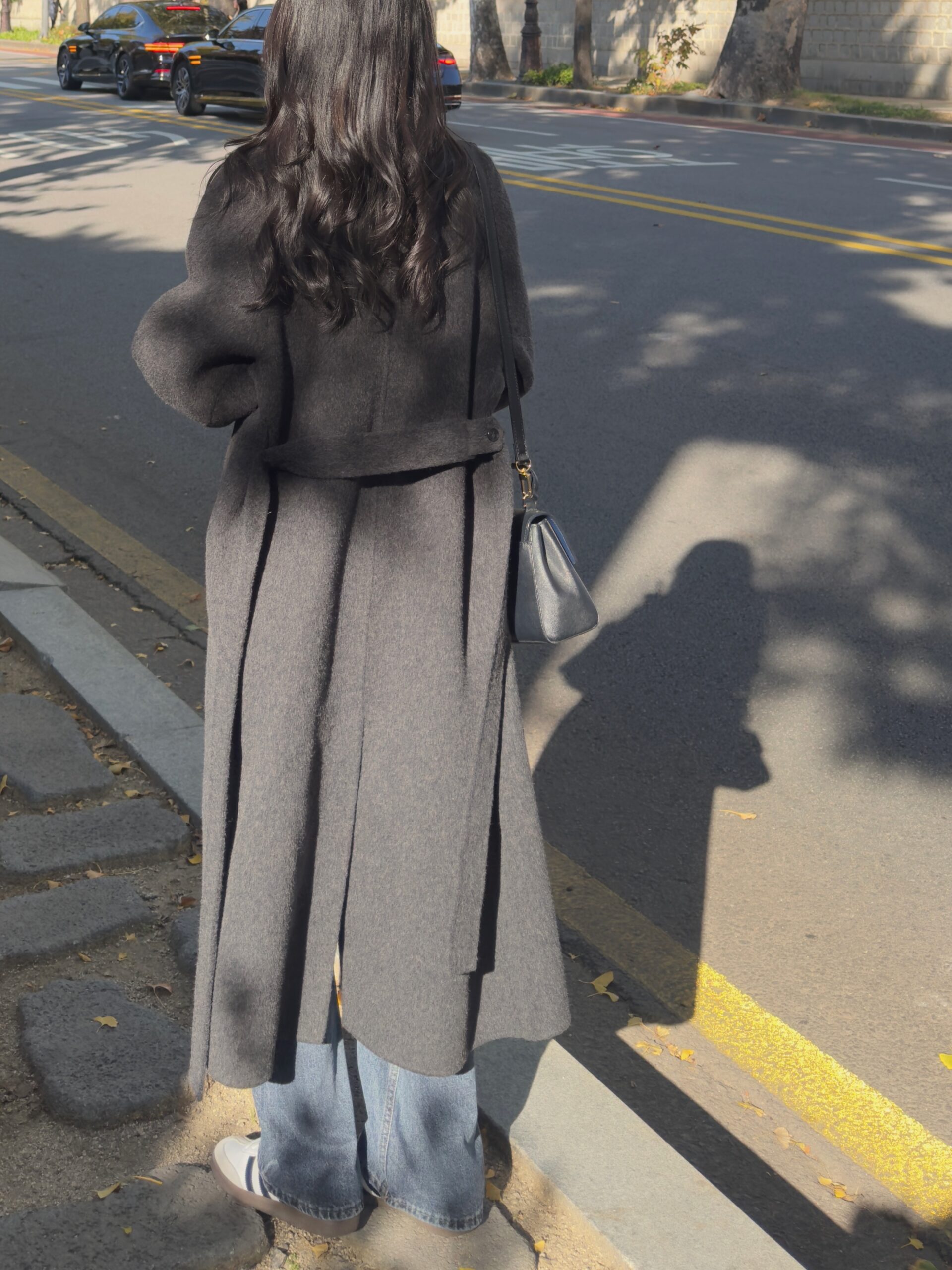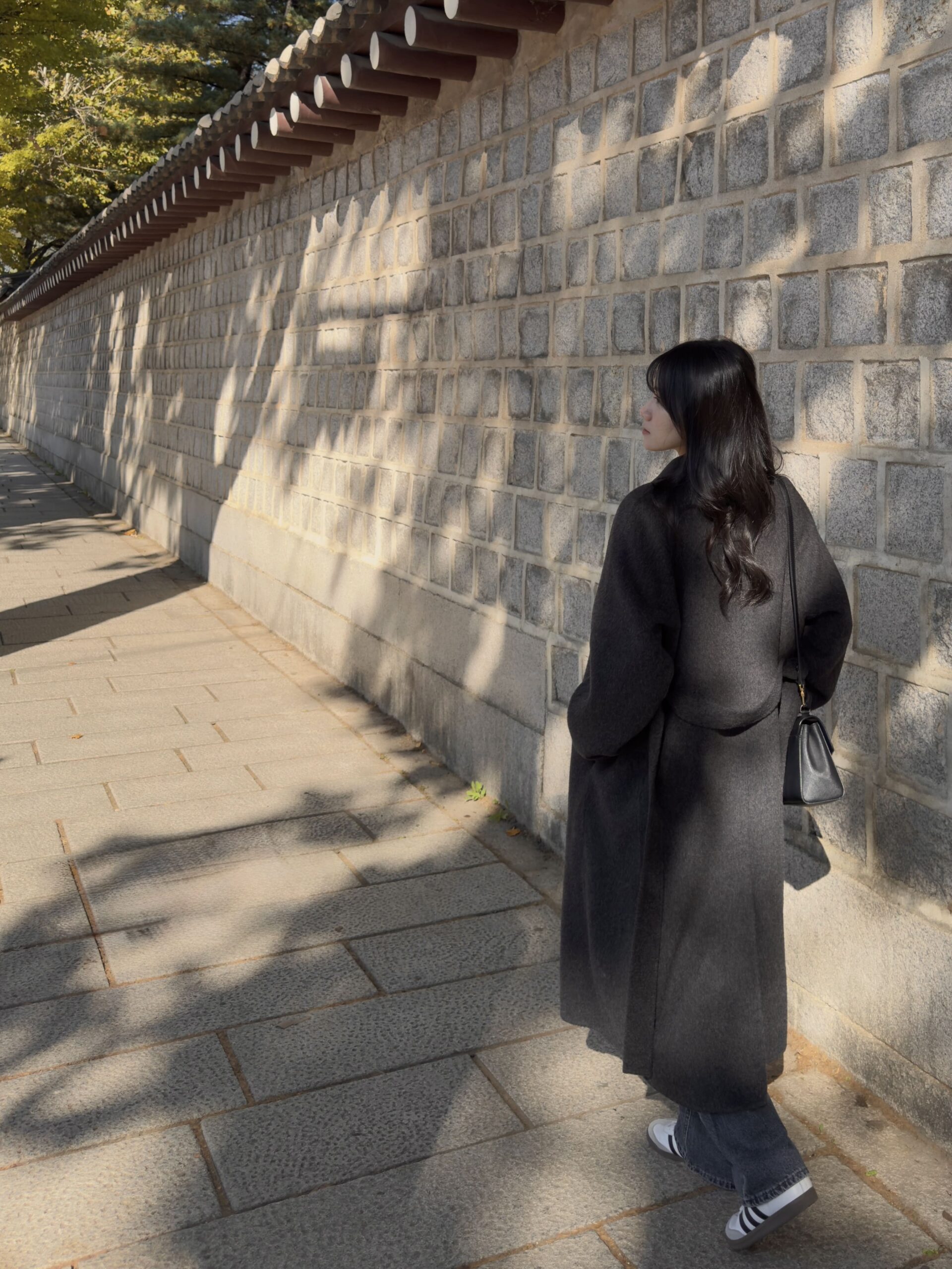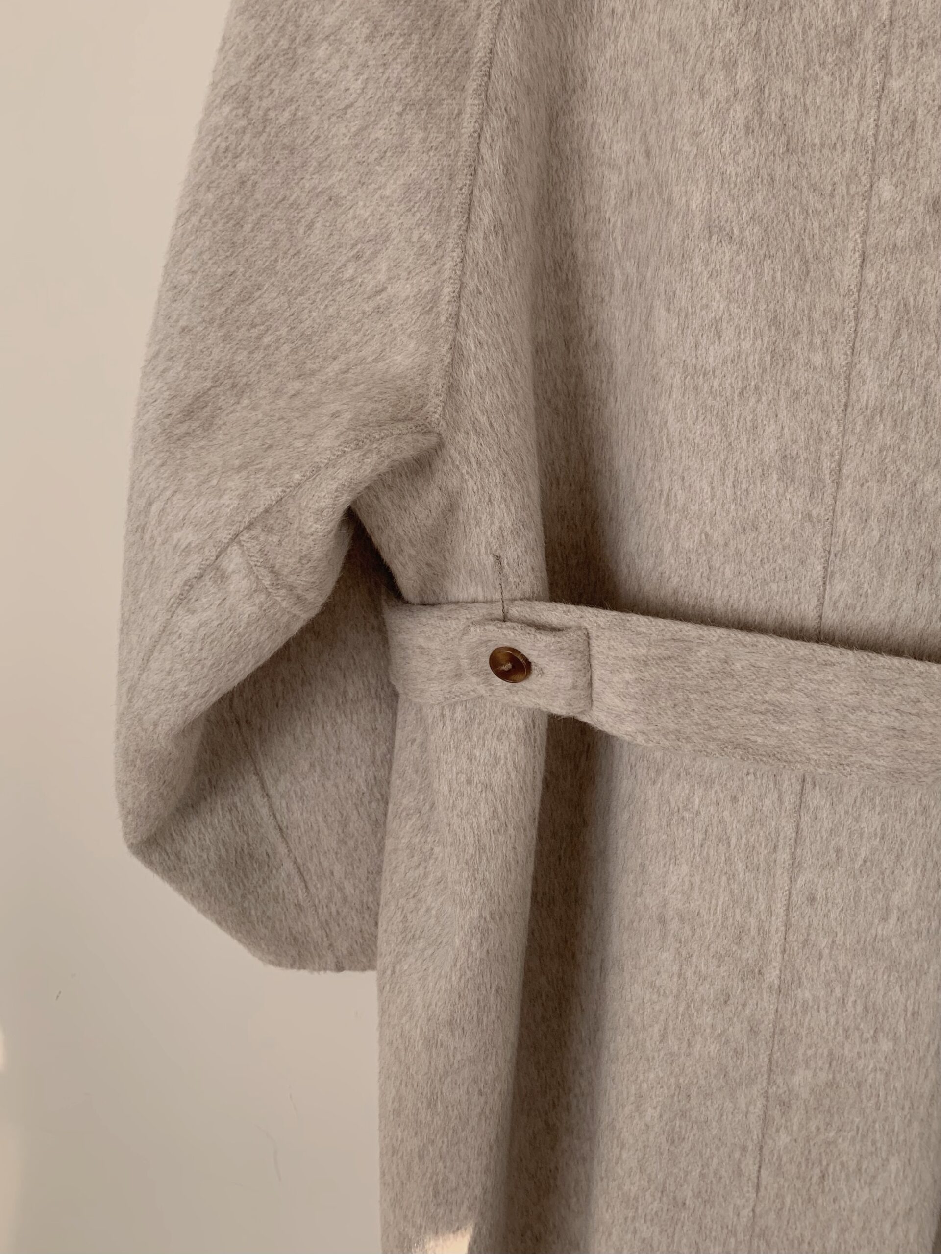 喜歡這件大衣材質的毛流感造成的特殊色感,雖然是灰色,但某些角度看起來卻帶點燕麥色,非常高級!整件大衣設計簡約,但各個細節都不馬虎~外加綁帶能固定真的很加分👍
