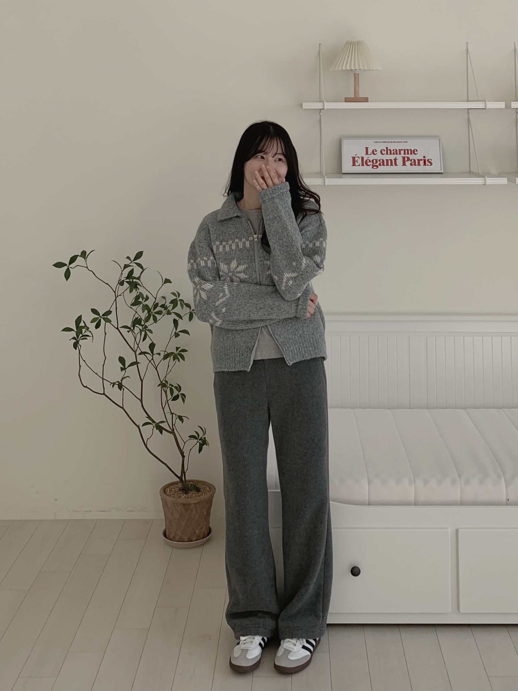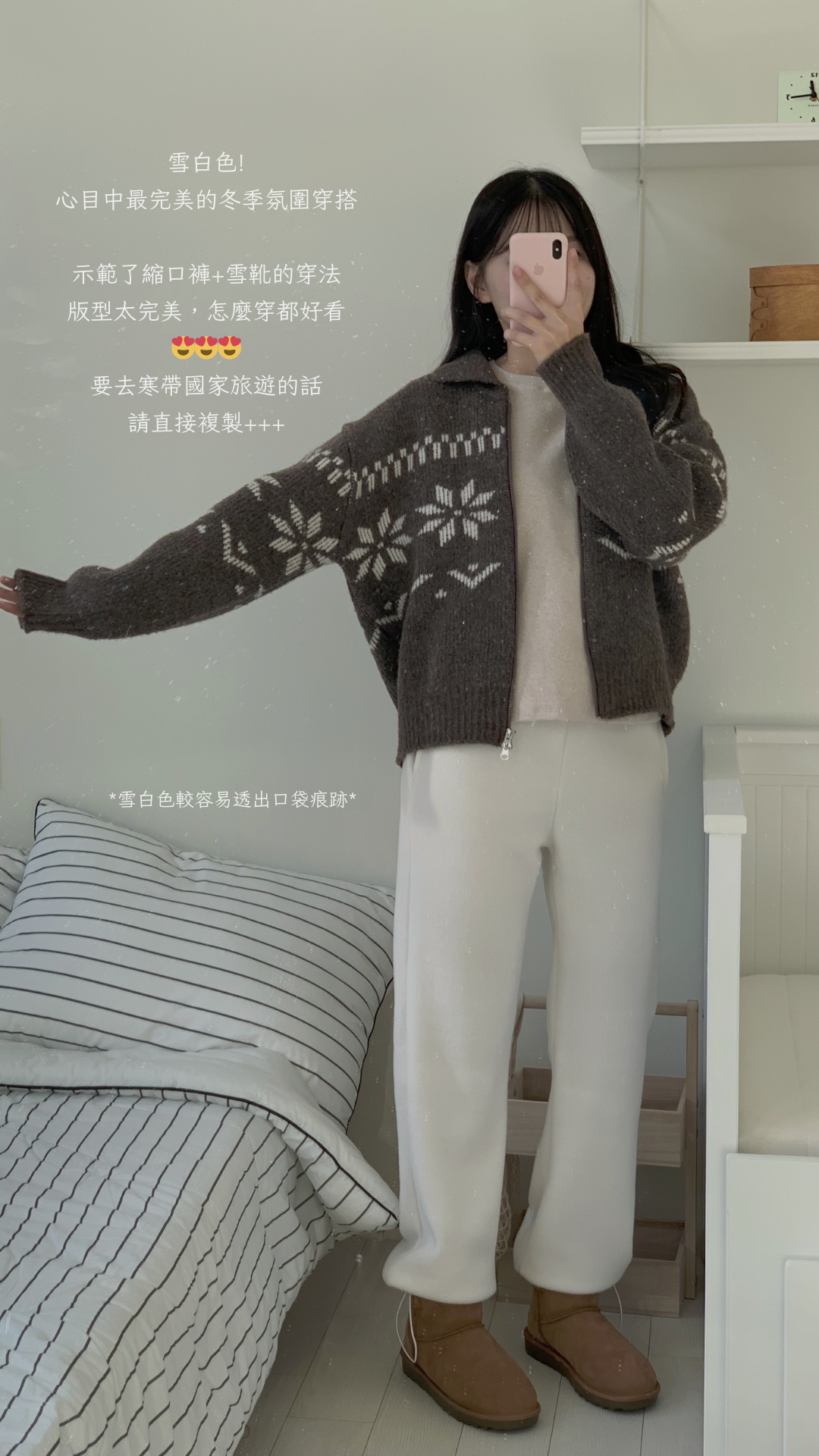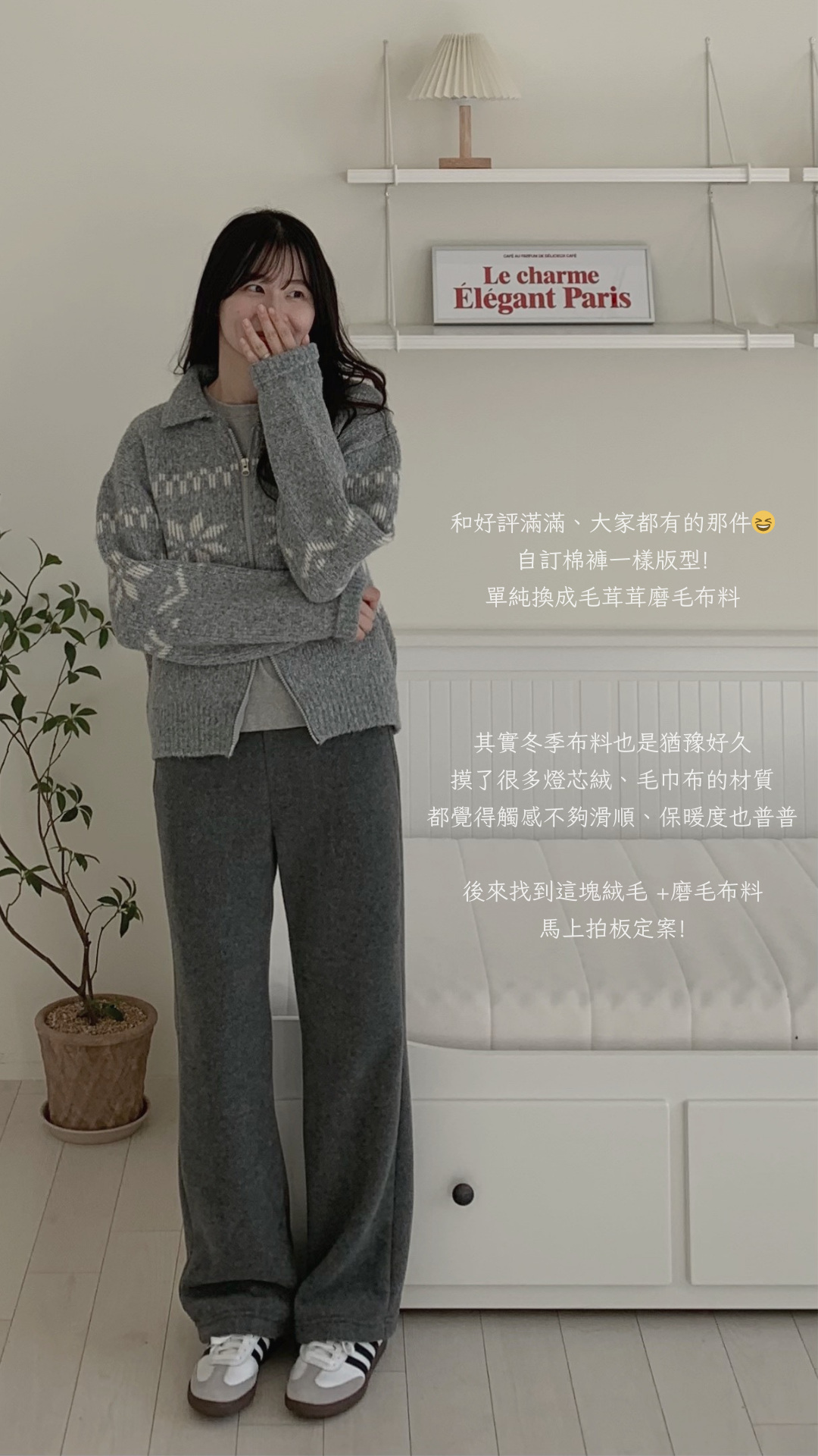 超級令人驚艷的褲子!材質柔軟,穿起來很保暖,重點是版型很順顯腿長,雖然是絨毛褲卻沒有睡褲感,寒流或出國的必備單品✨