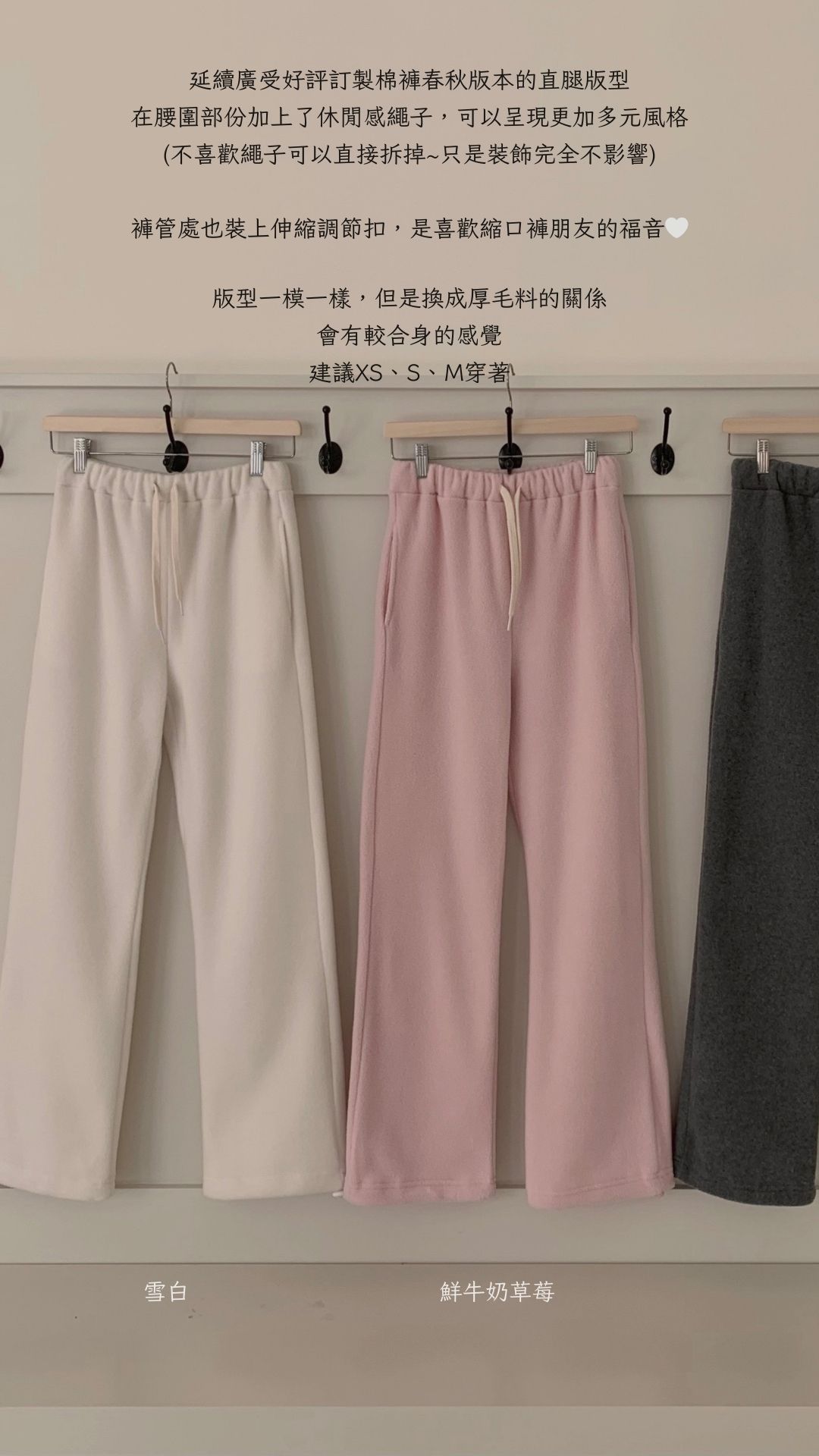 材質親膚舒適又保暖,許願繭型版本的磨毛褲也可以出繽紛的顏色🩵