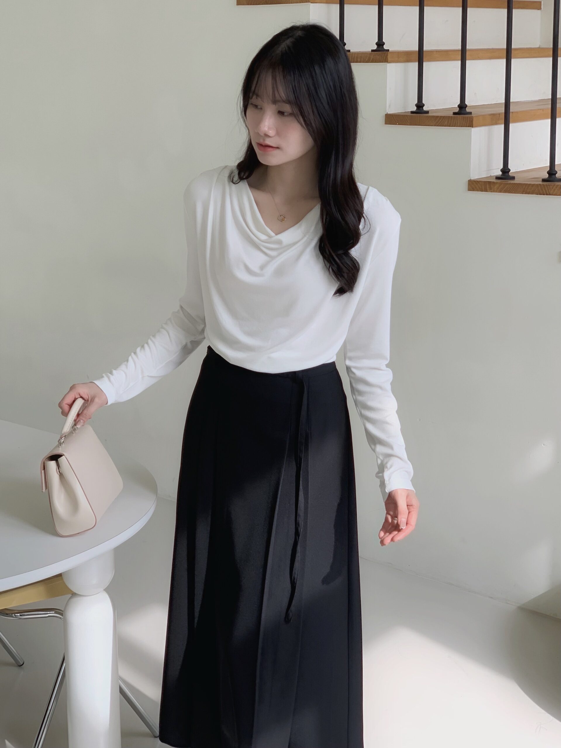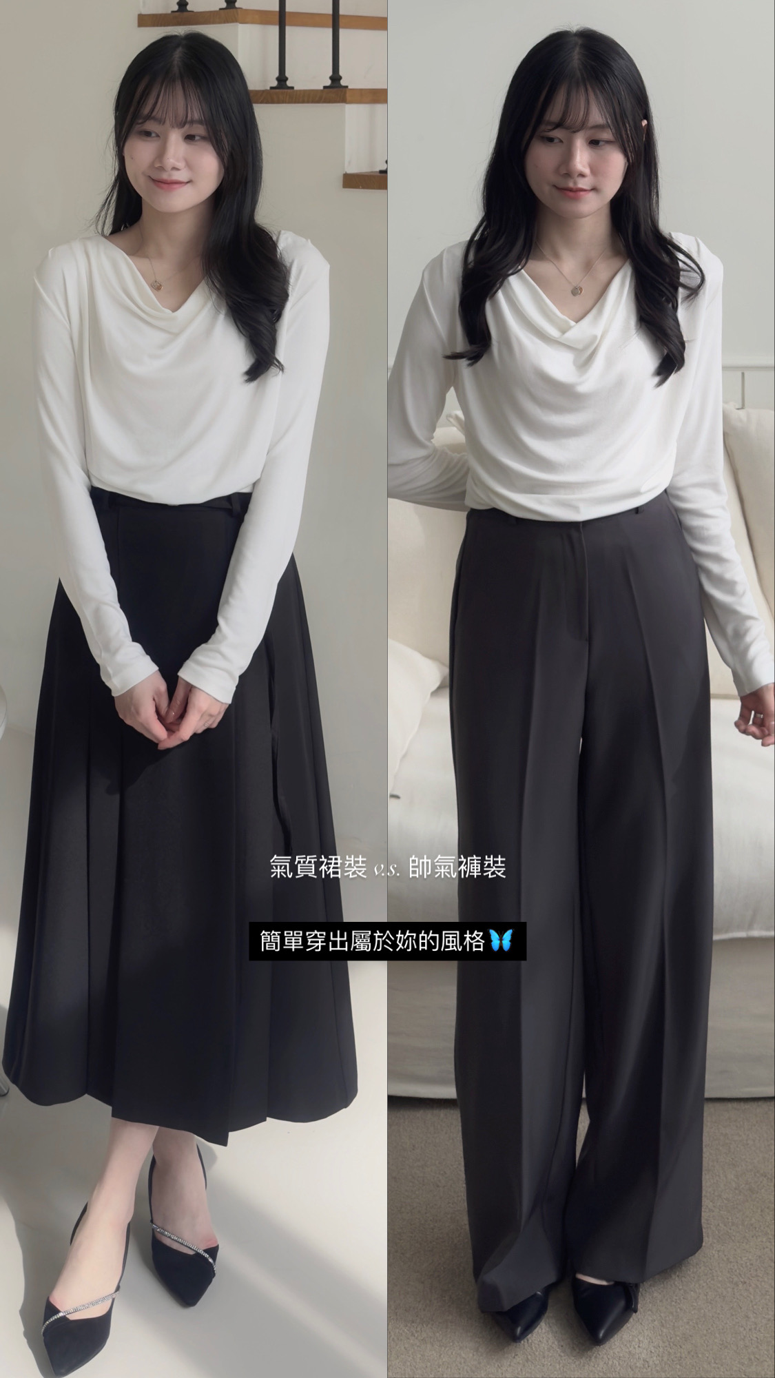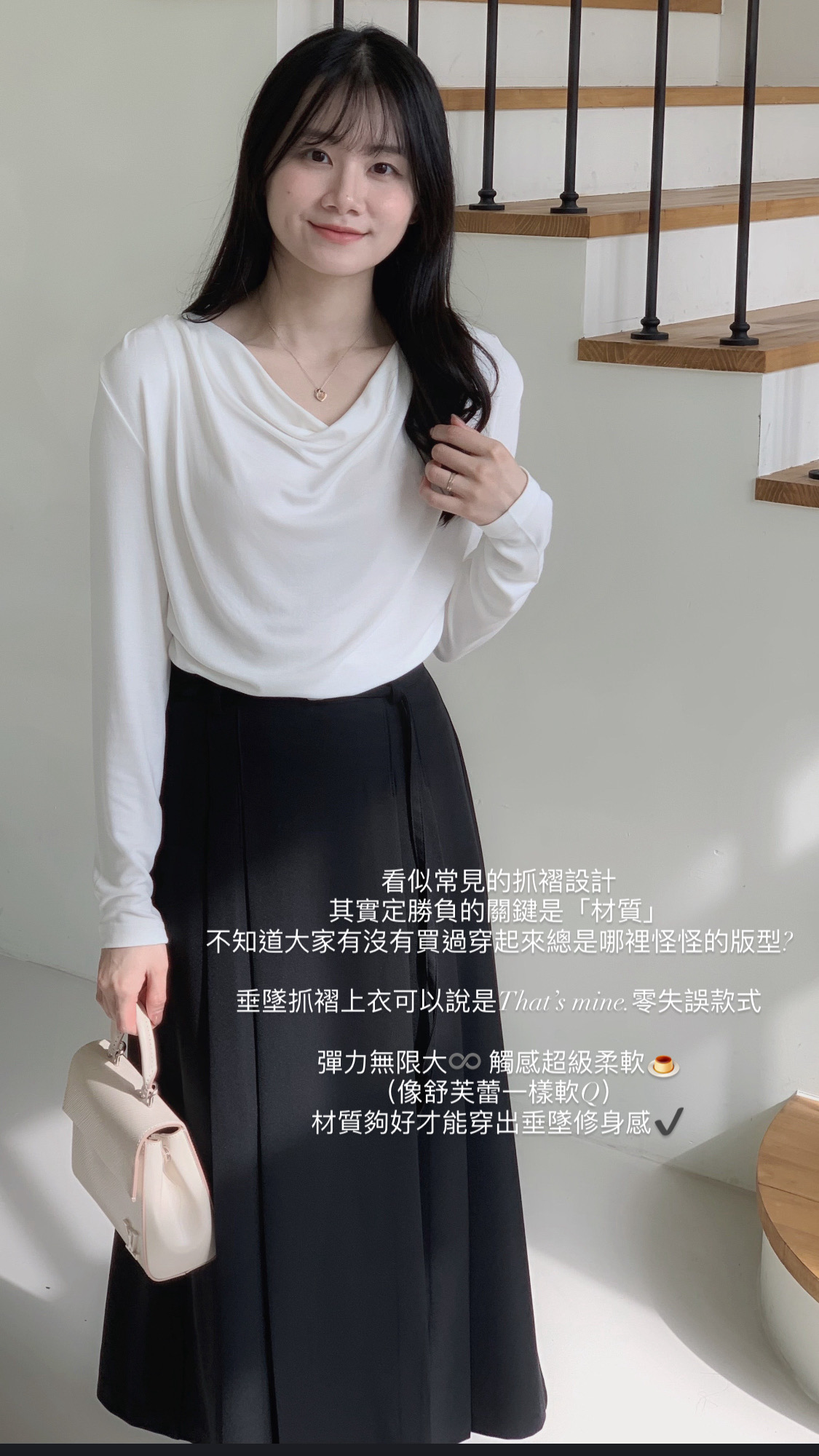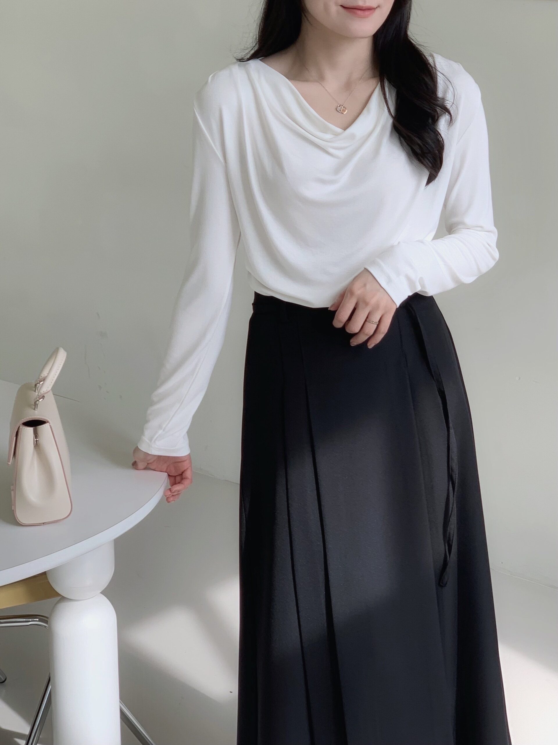 白色垂墜上衣+黑色雙褶長裙組合優雅無敵