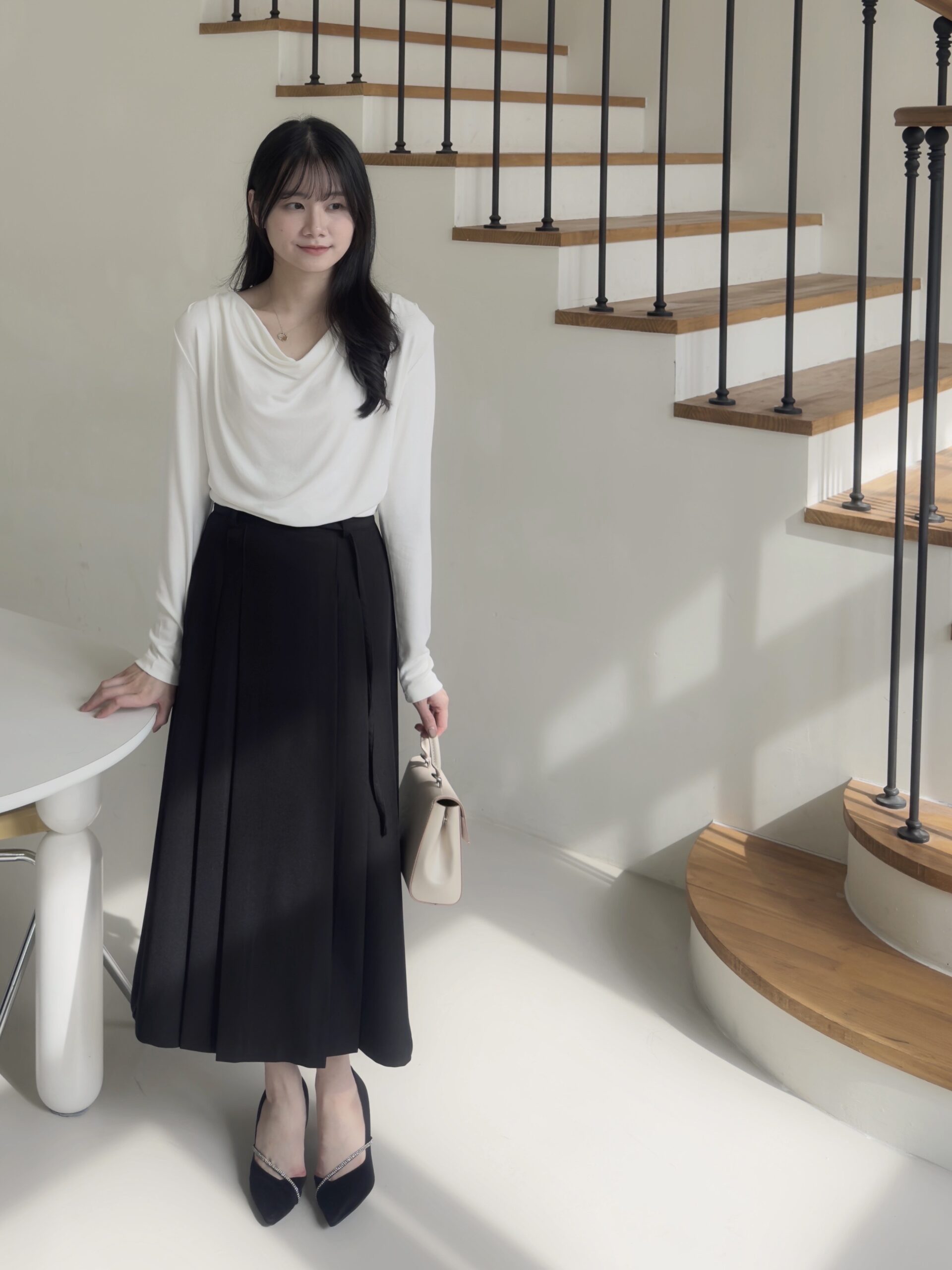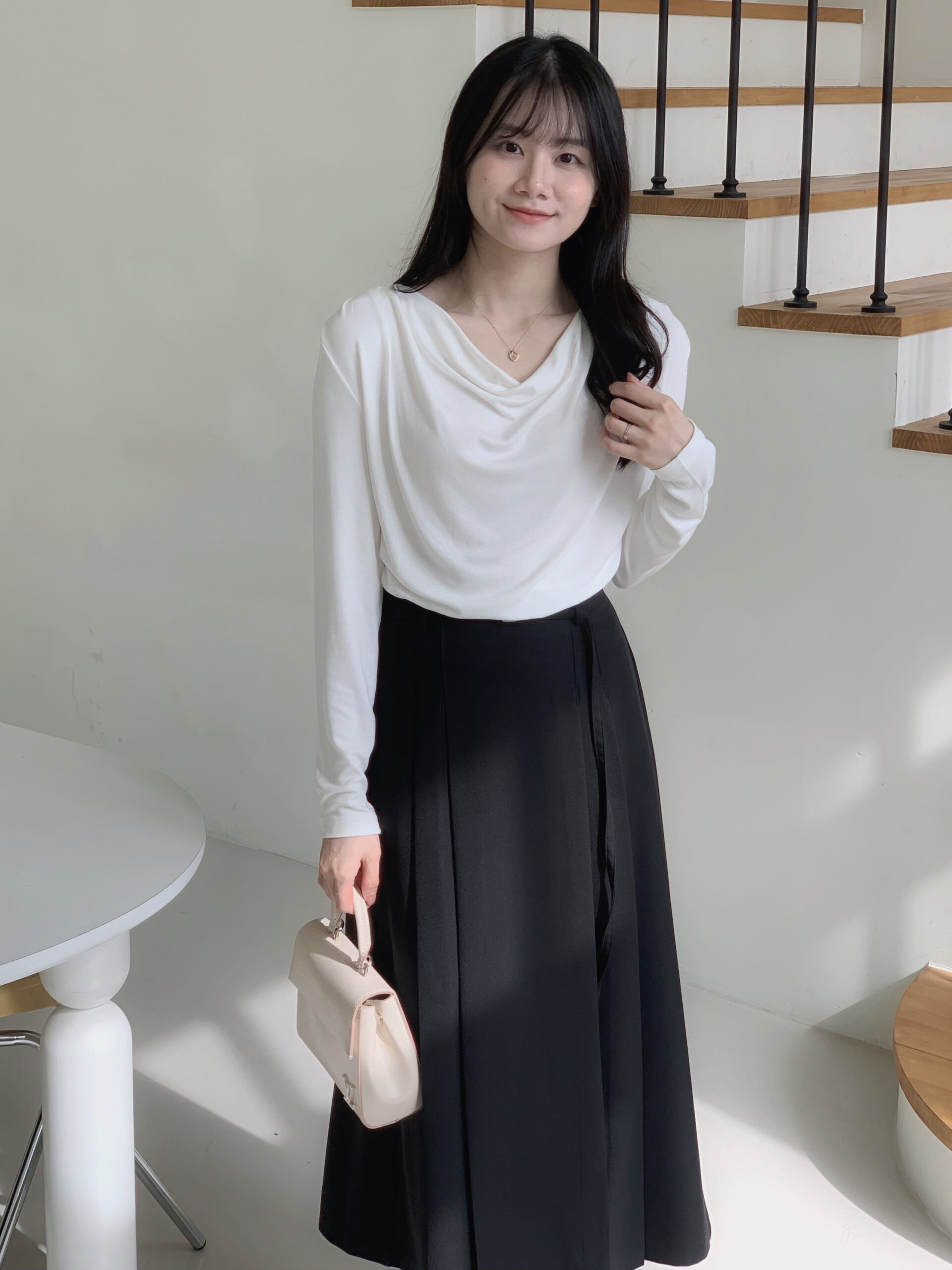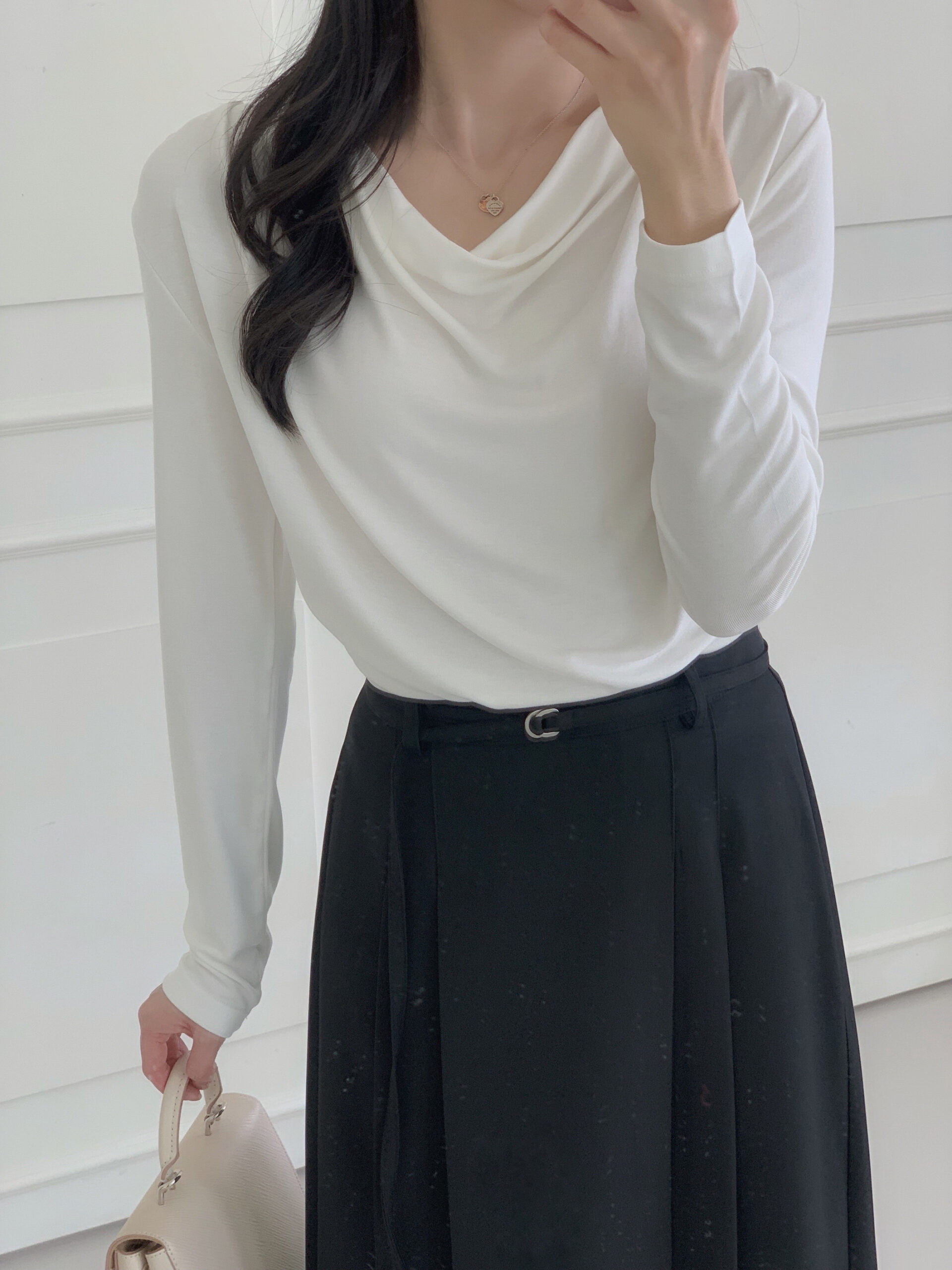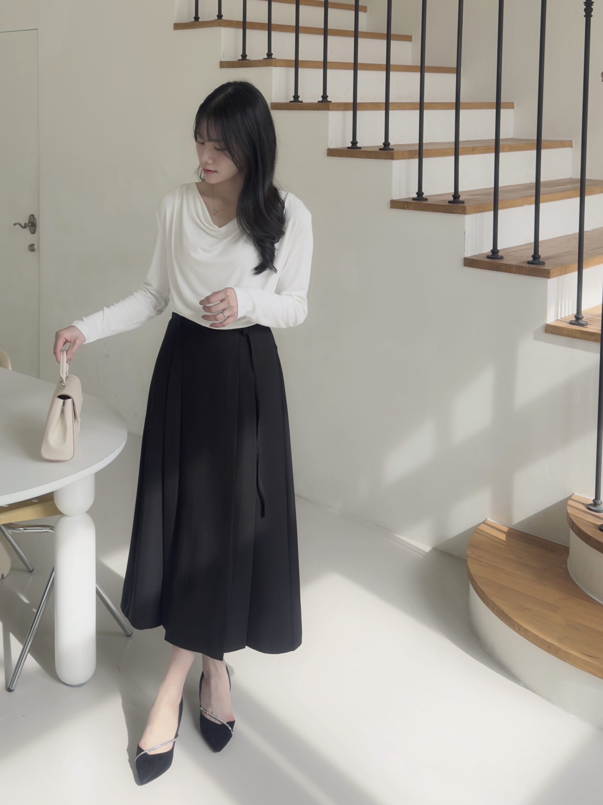 白色垂墜上衣+黑色雙褶長裙組合優雅無敵