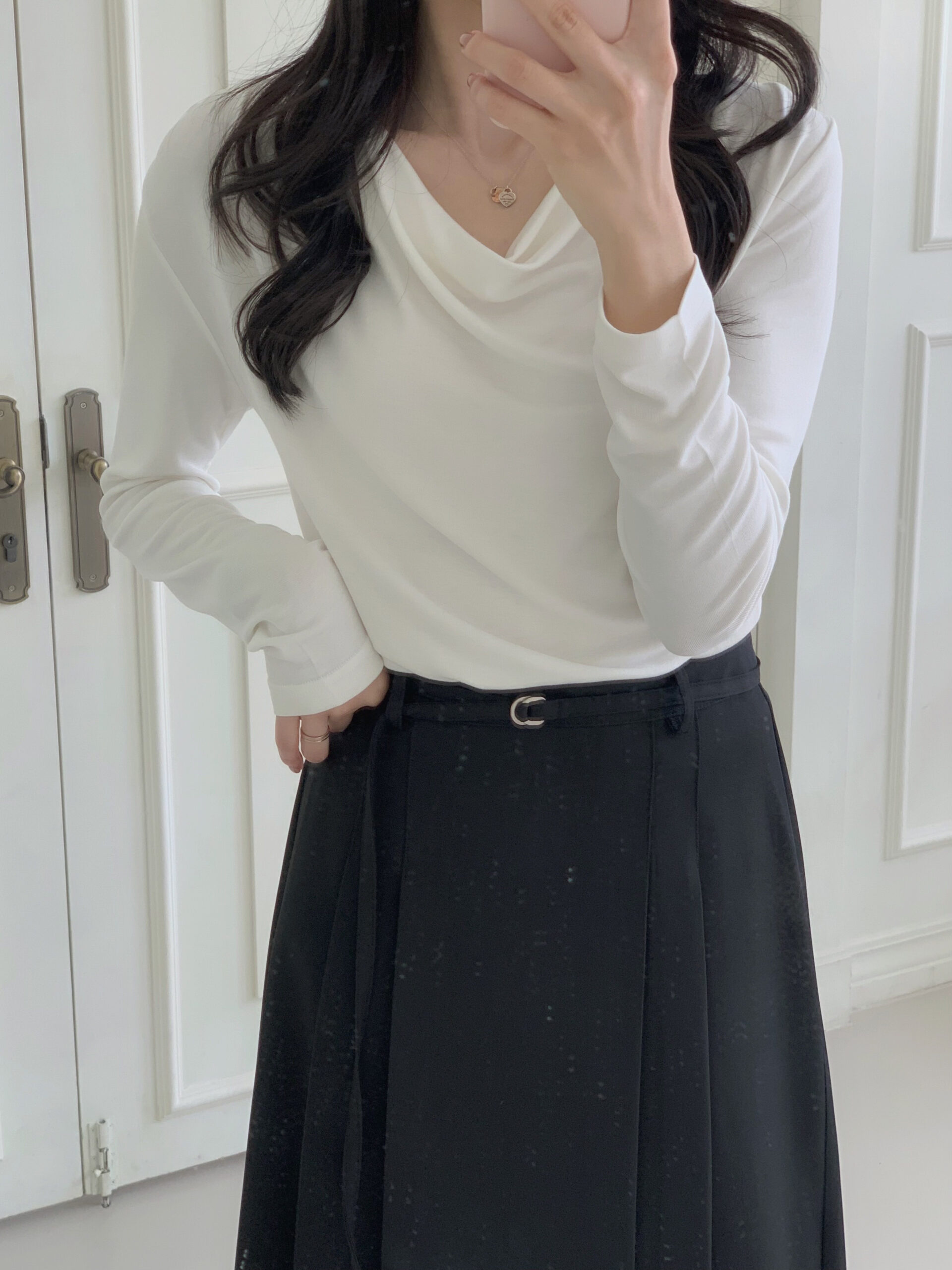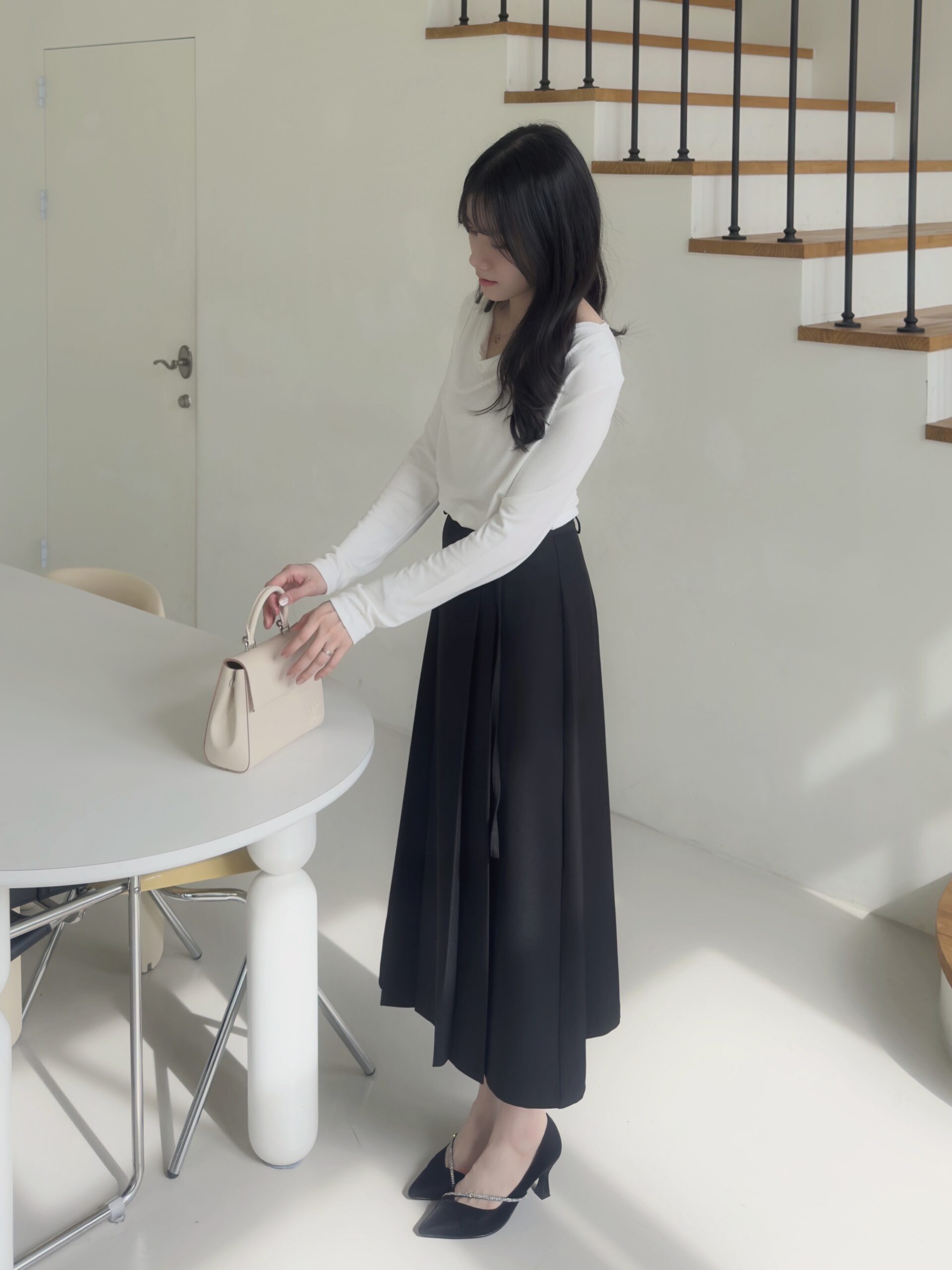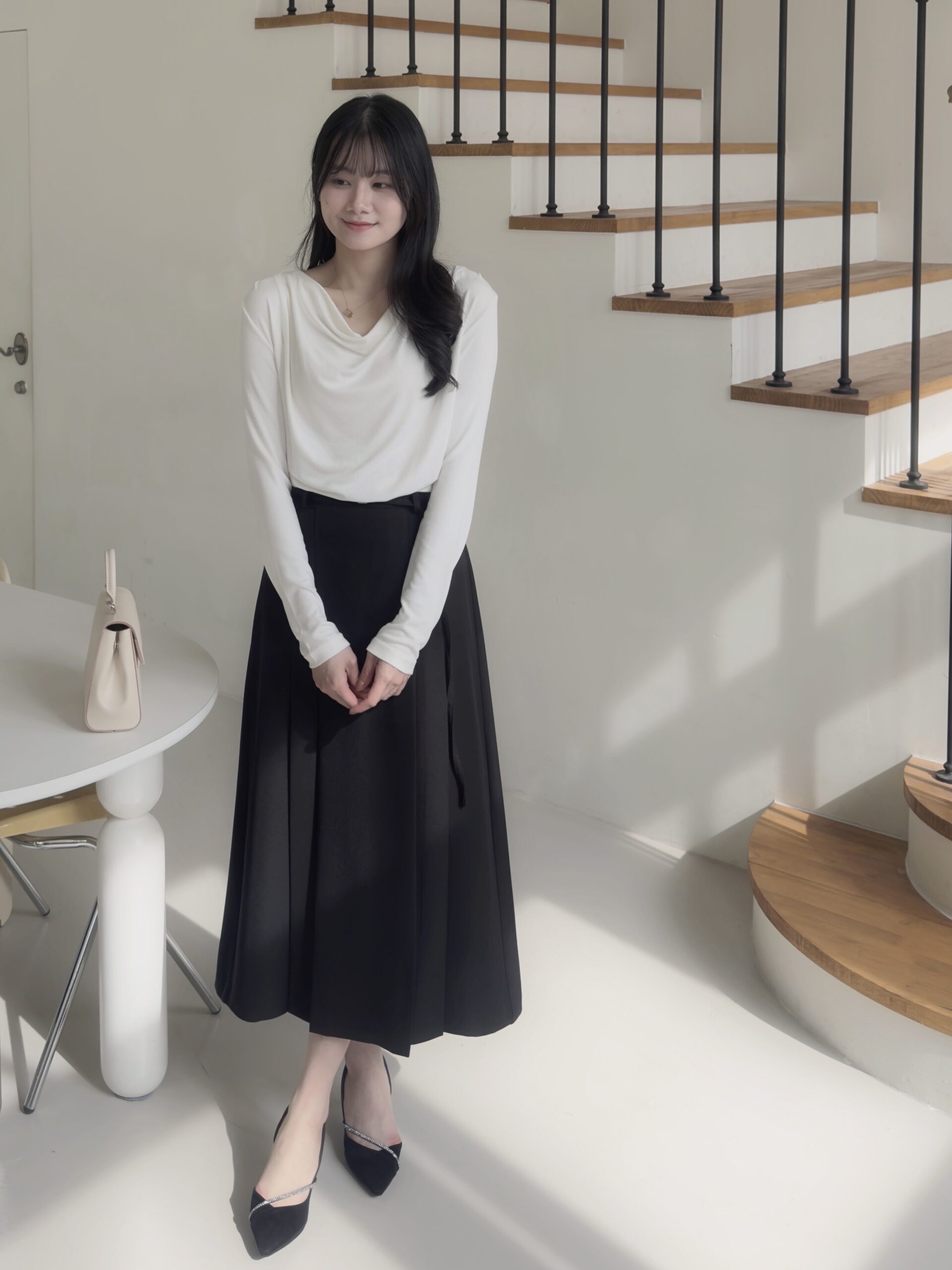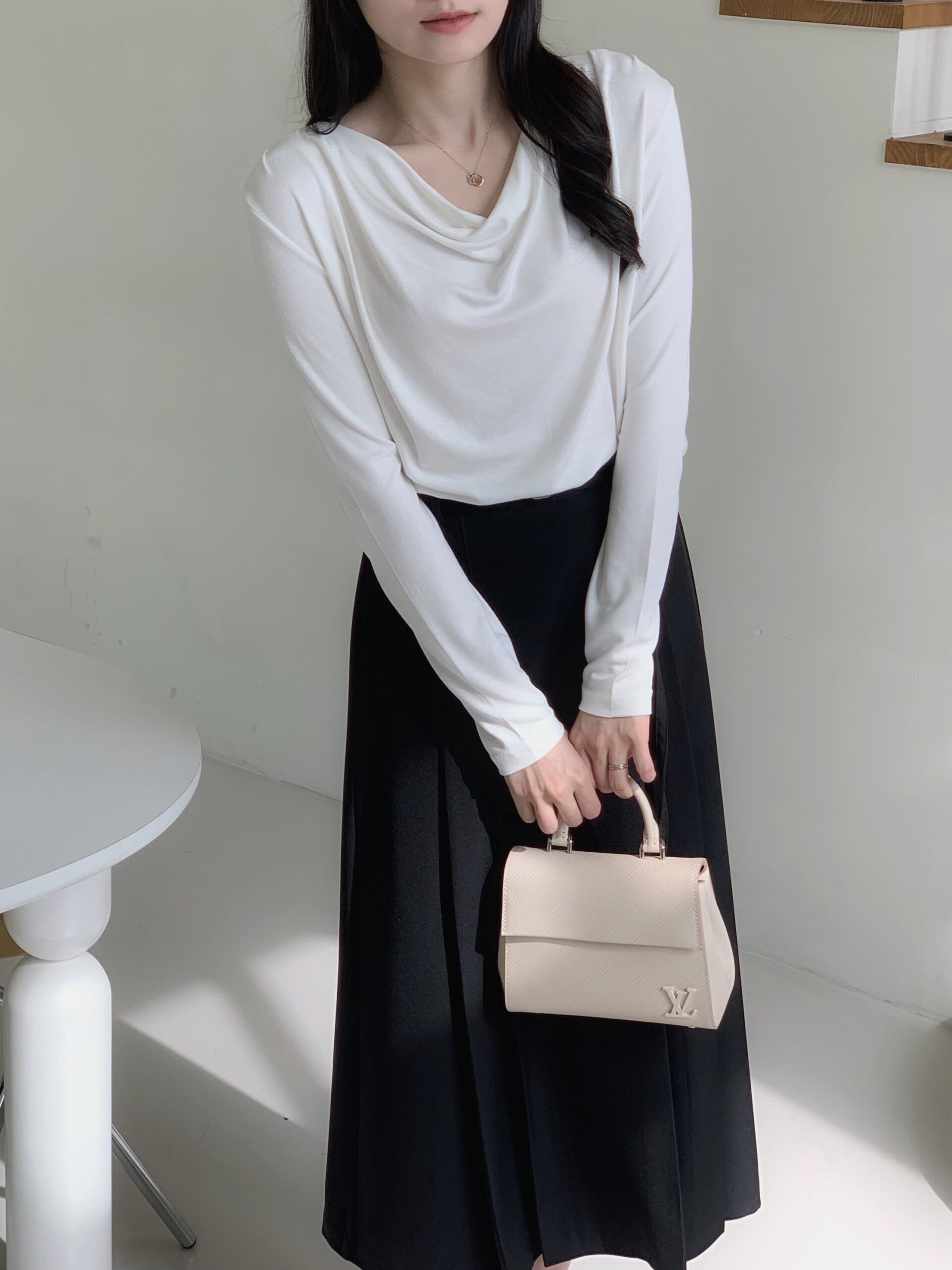白色垂墜上衣+黑色雙褶長裙組合優雅無敵