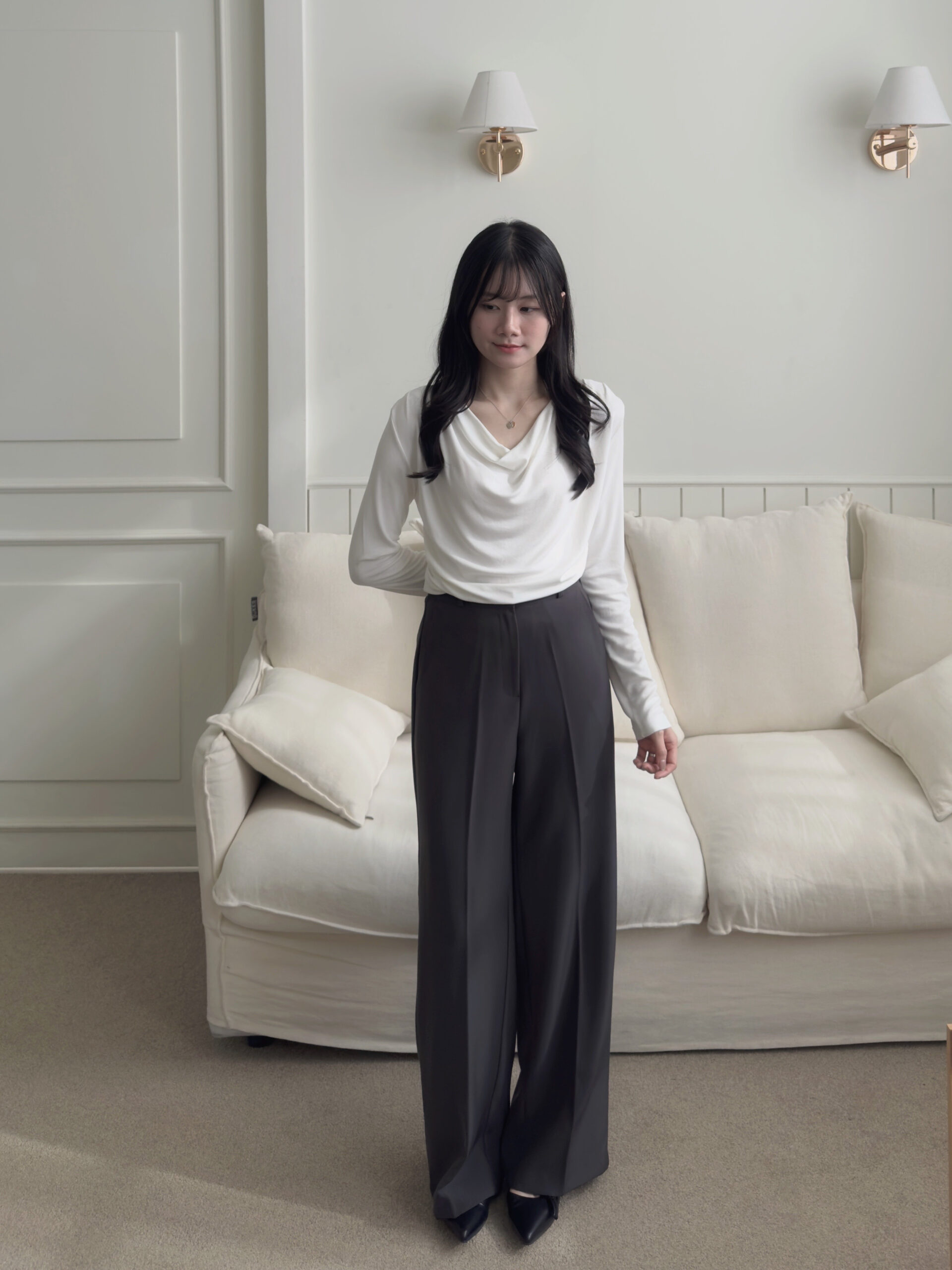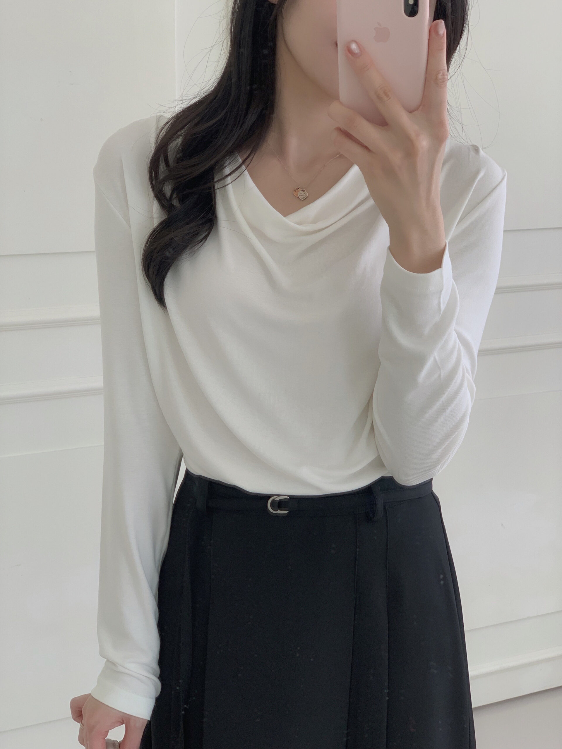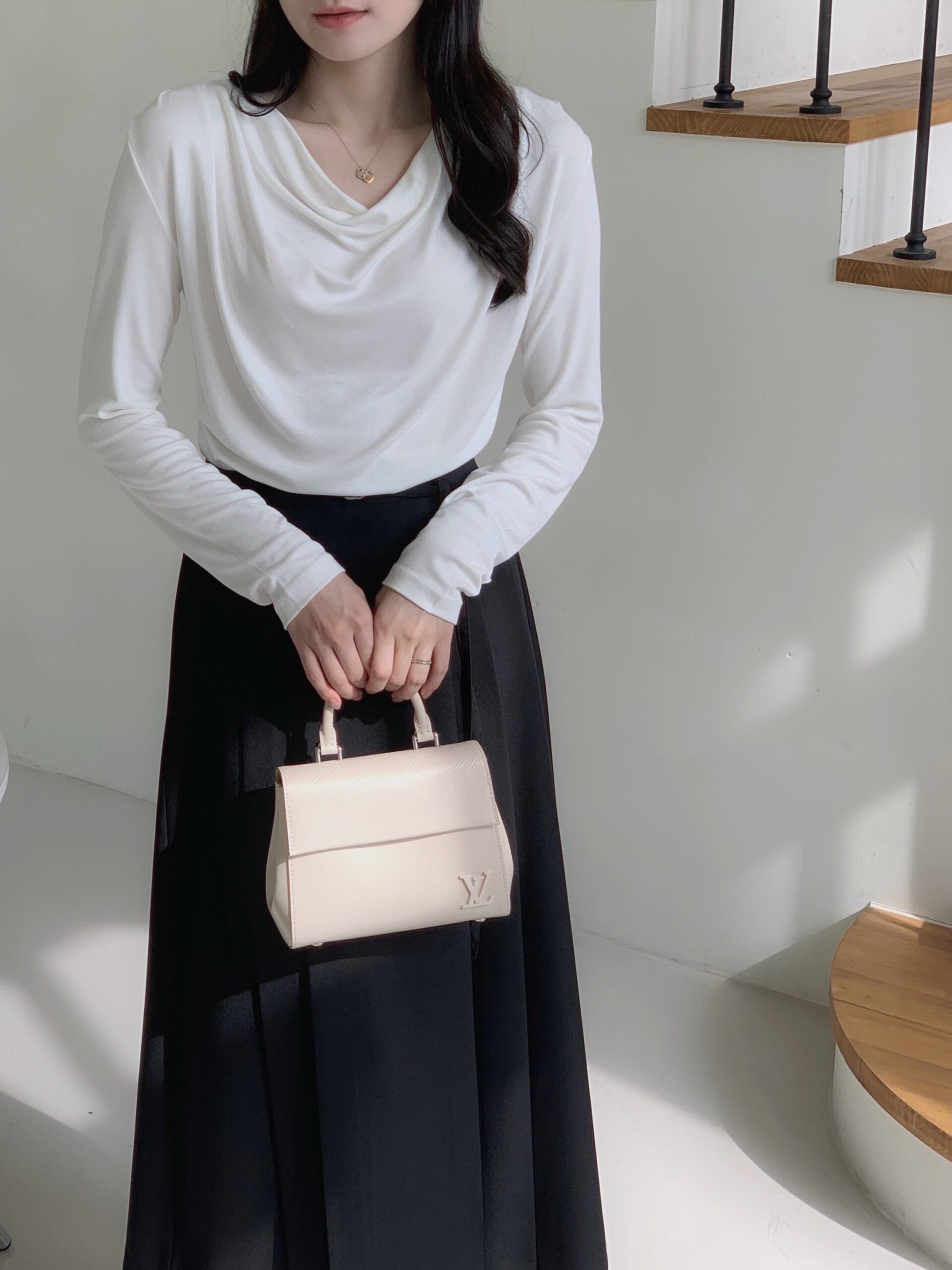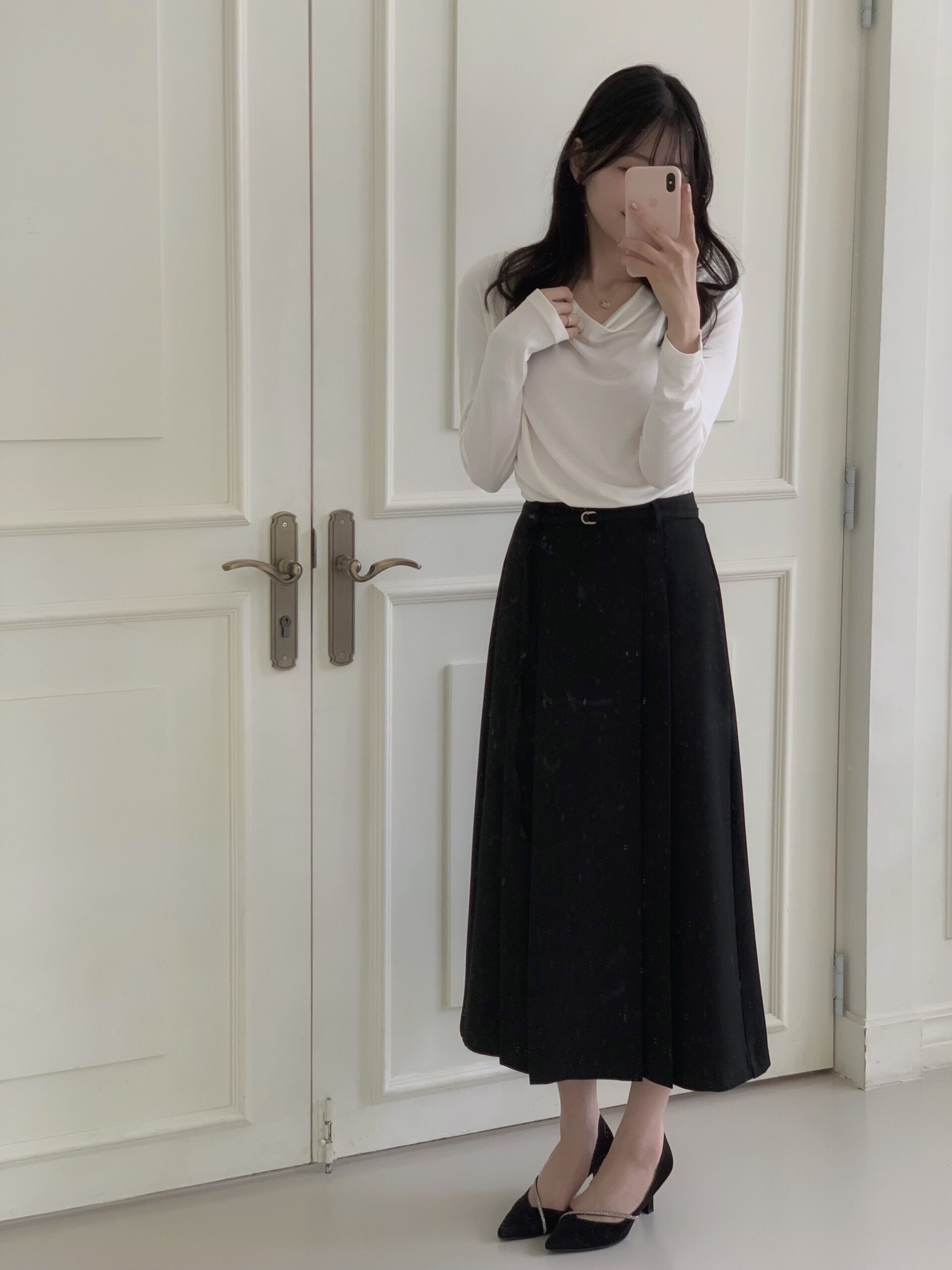 白色垂墜上衣+黑色雙褶長裙組合優雅無敵