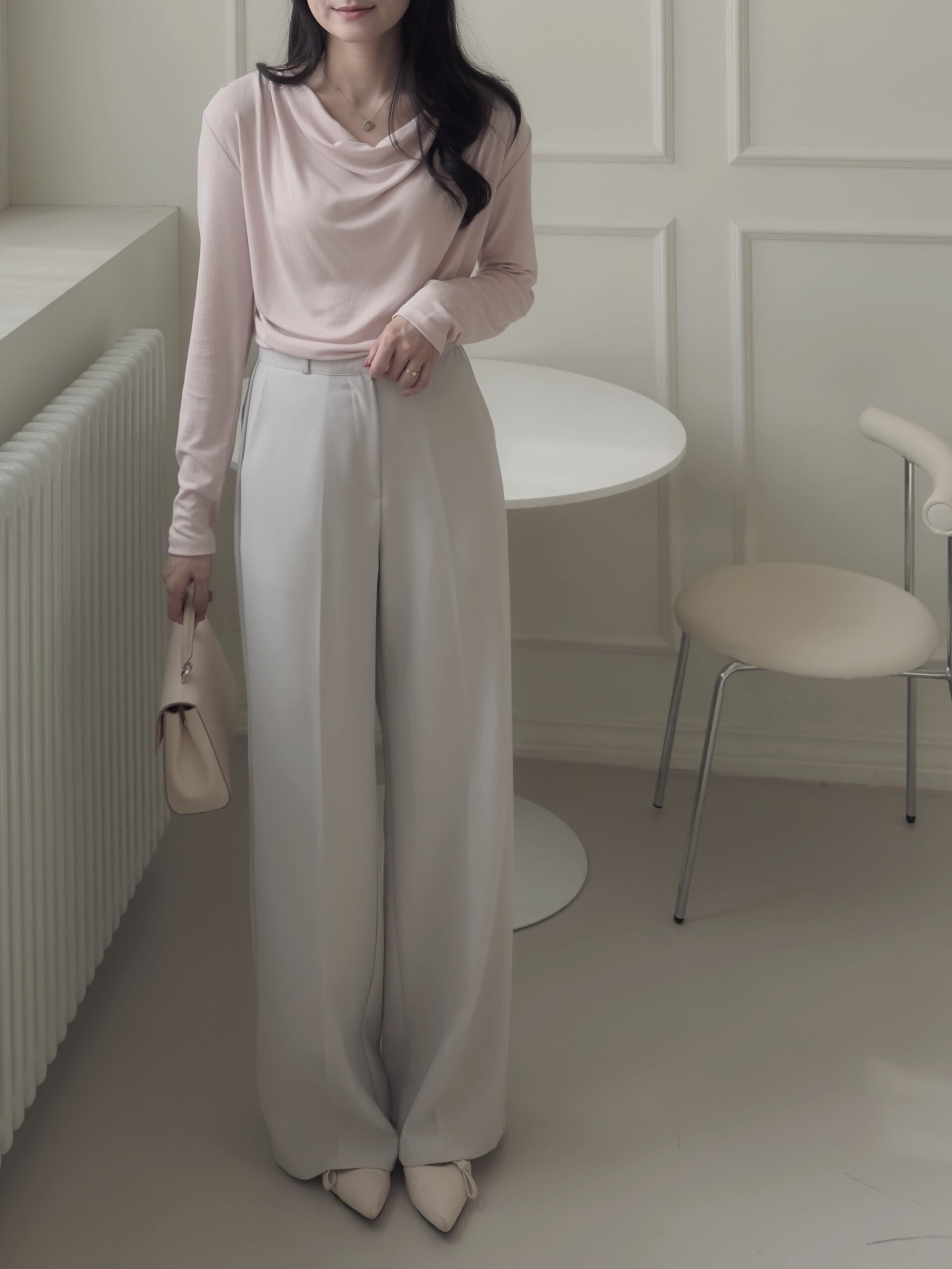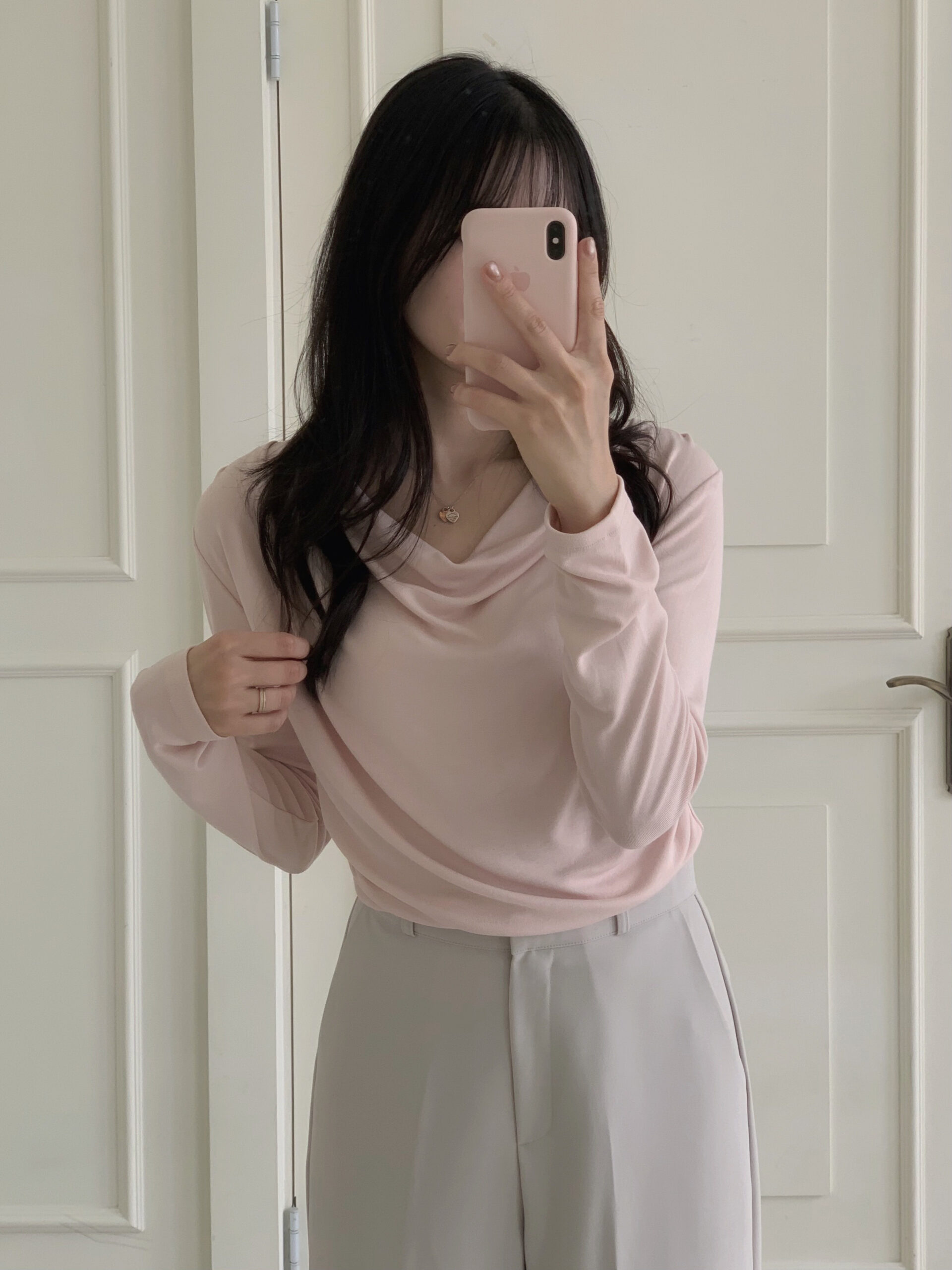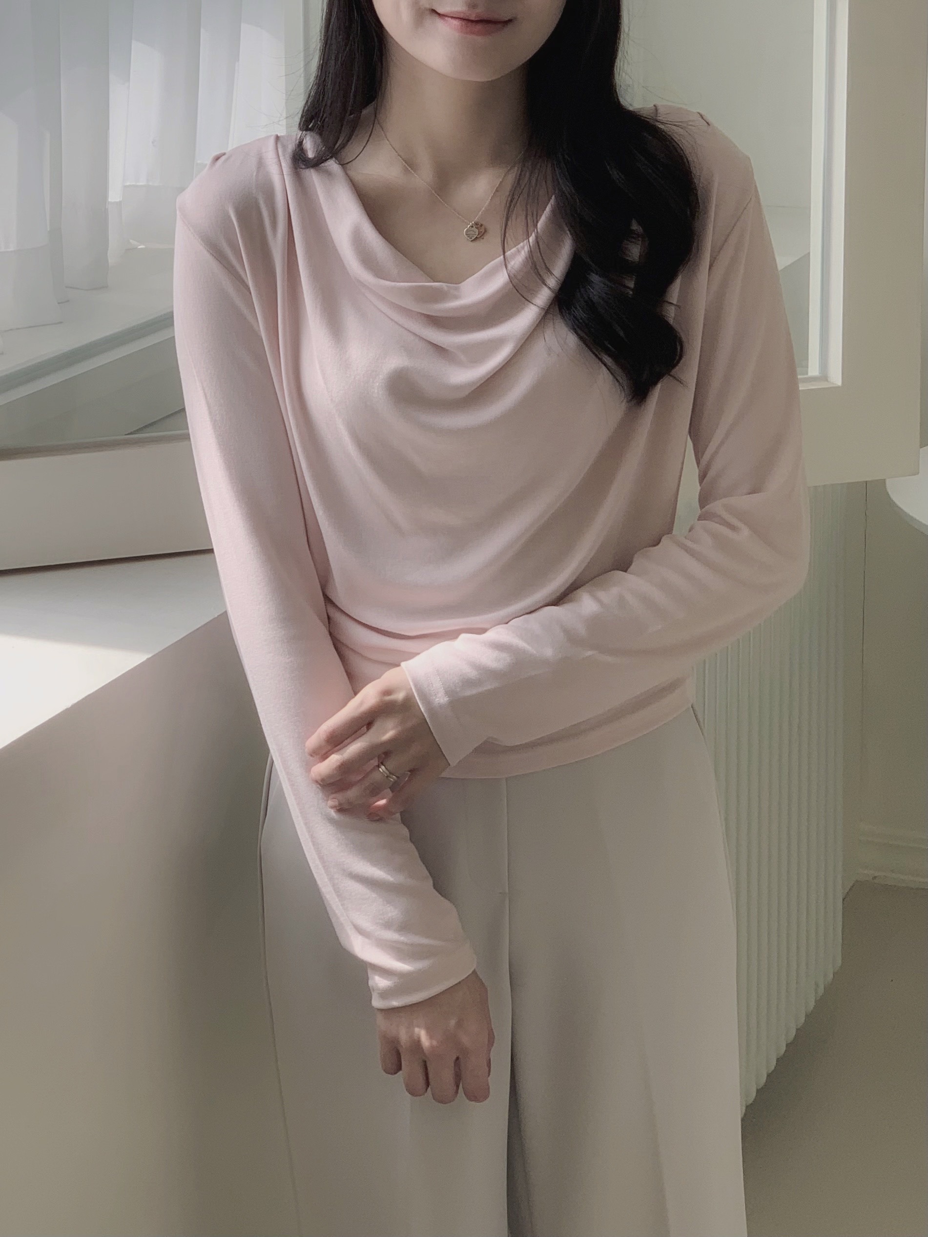 粉色的非常柔和好看,垂墜感明顯,上身效果很柔,日常穿搭上班約會都可以穿!