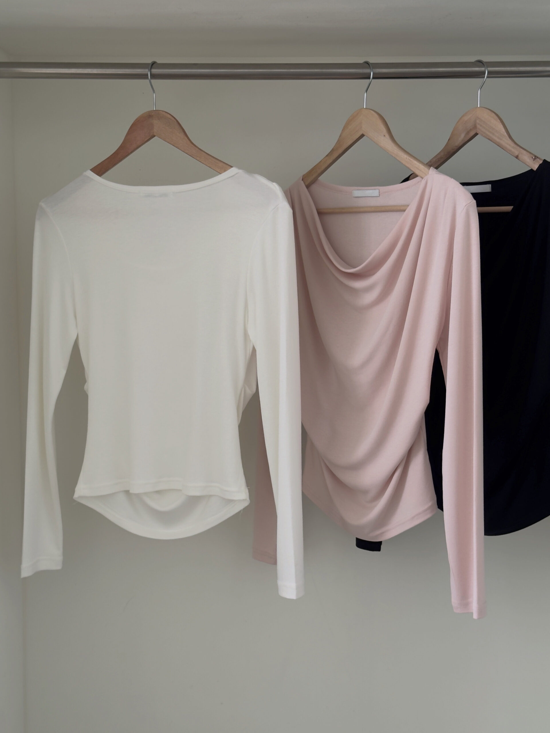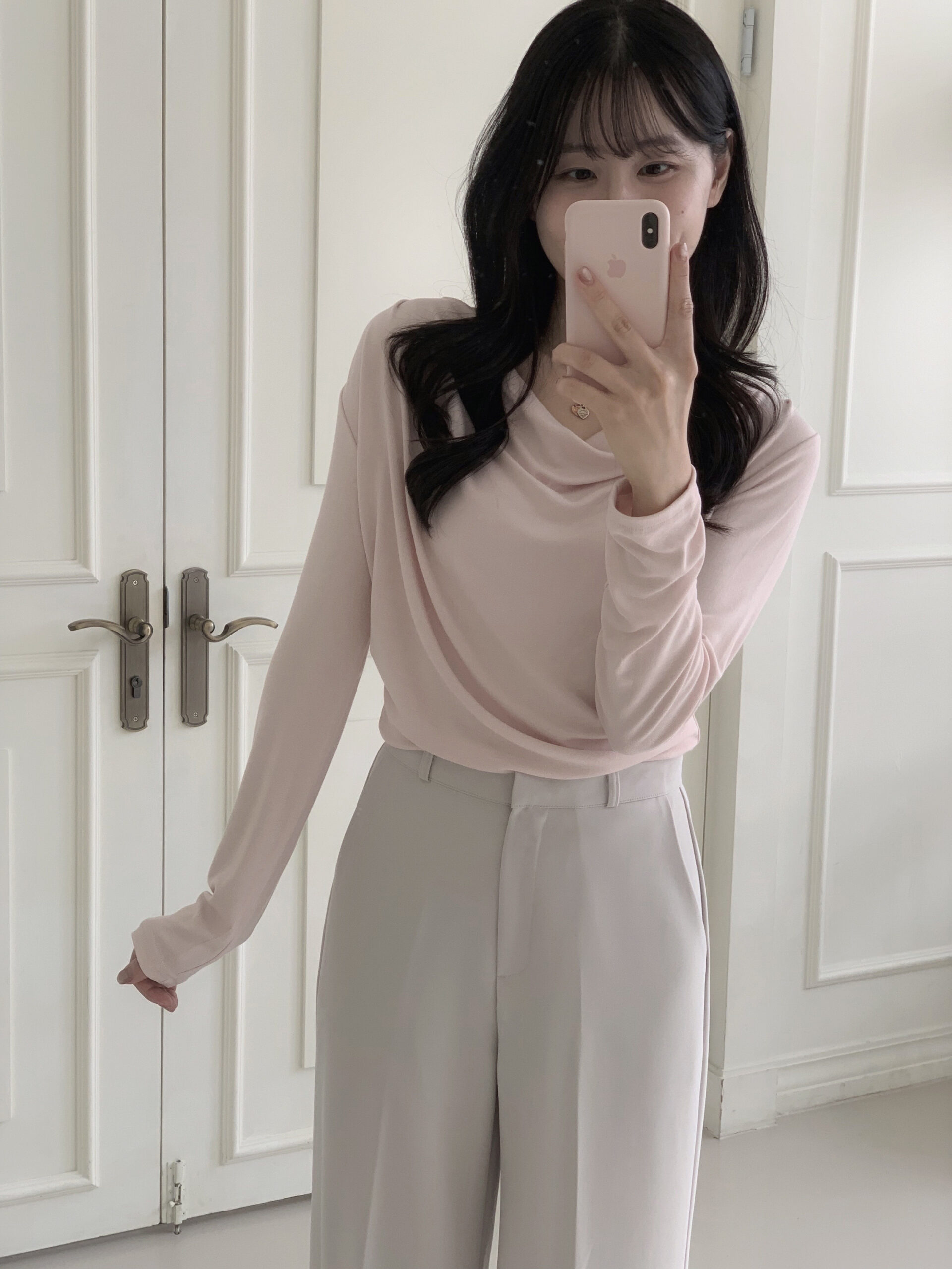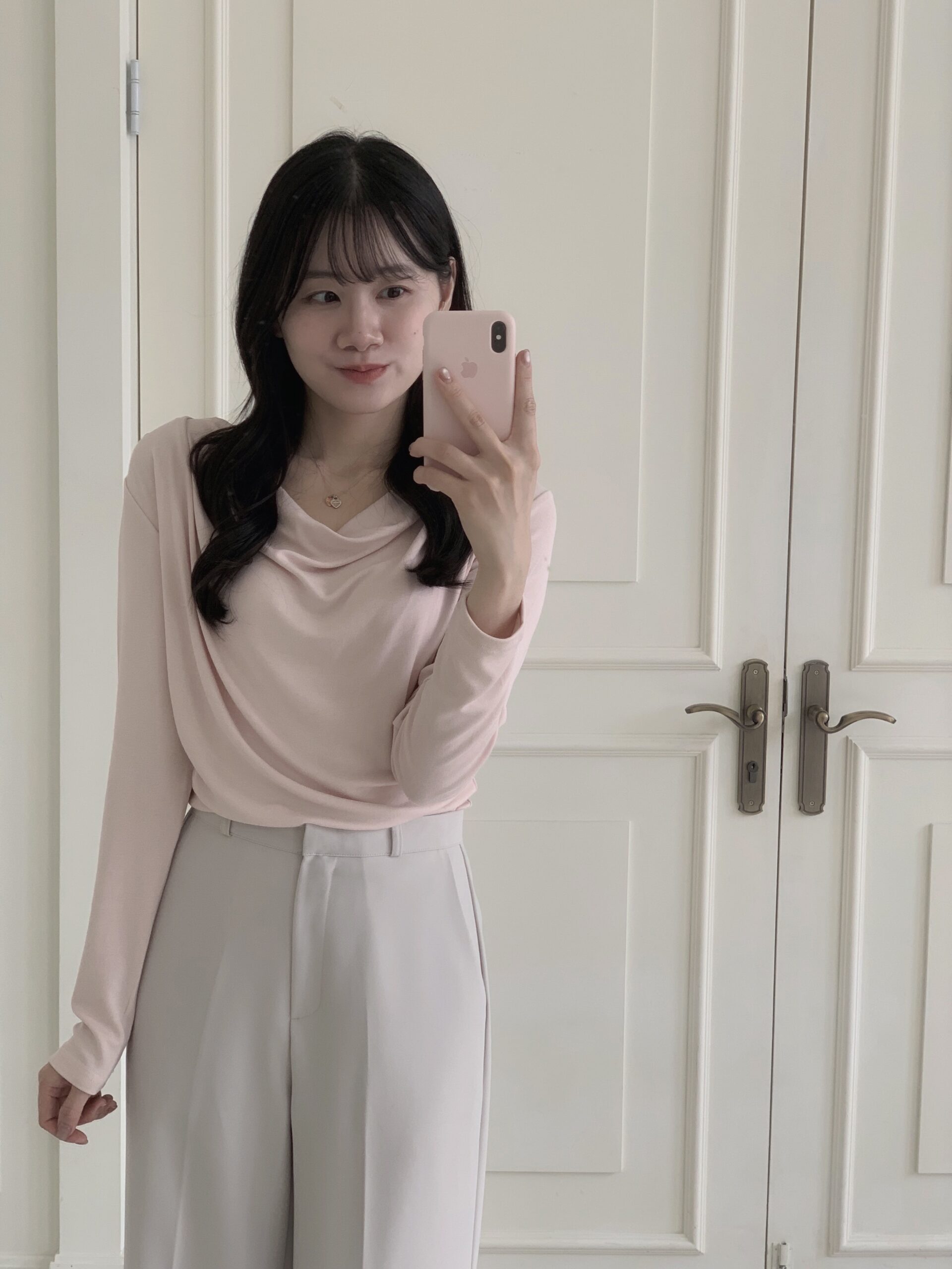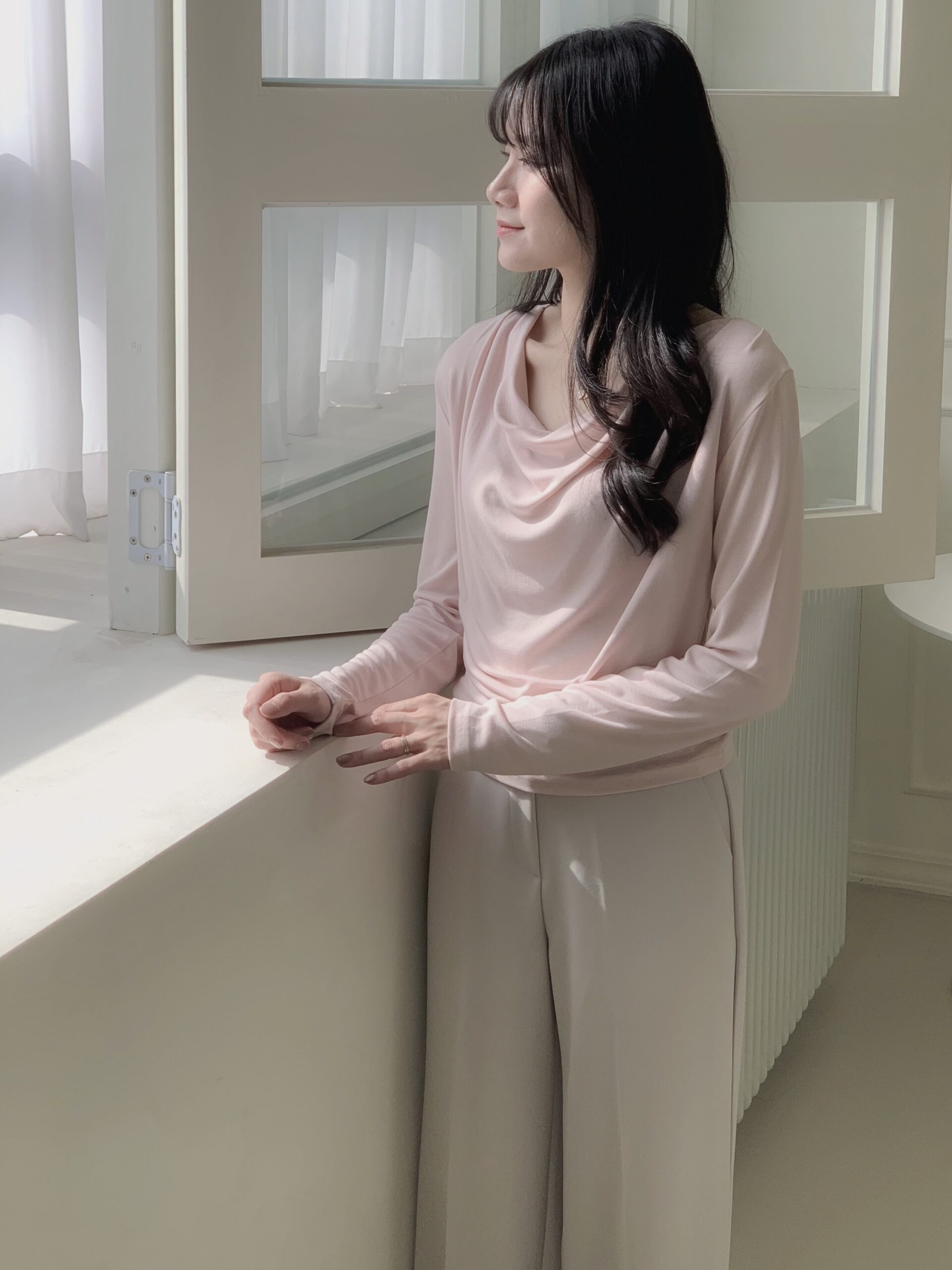 粉色的非常柔和好看,垂墜感明顯,上身效果很柔,日常穿搭上班約會都可以穿!