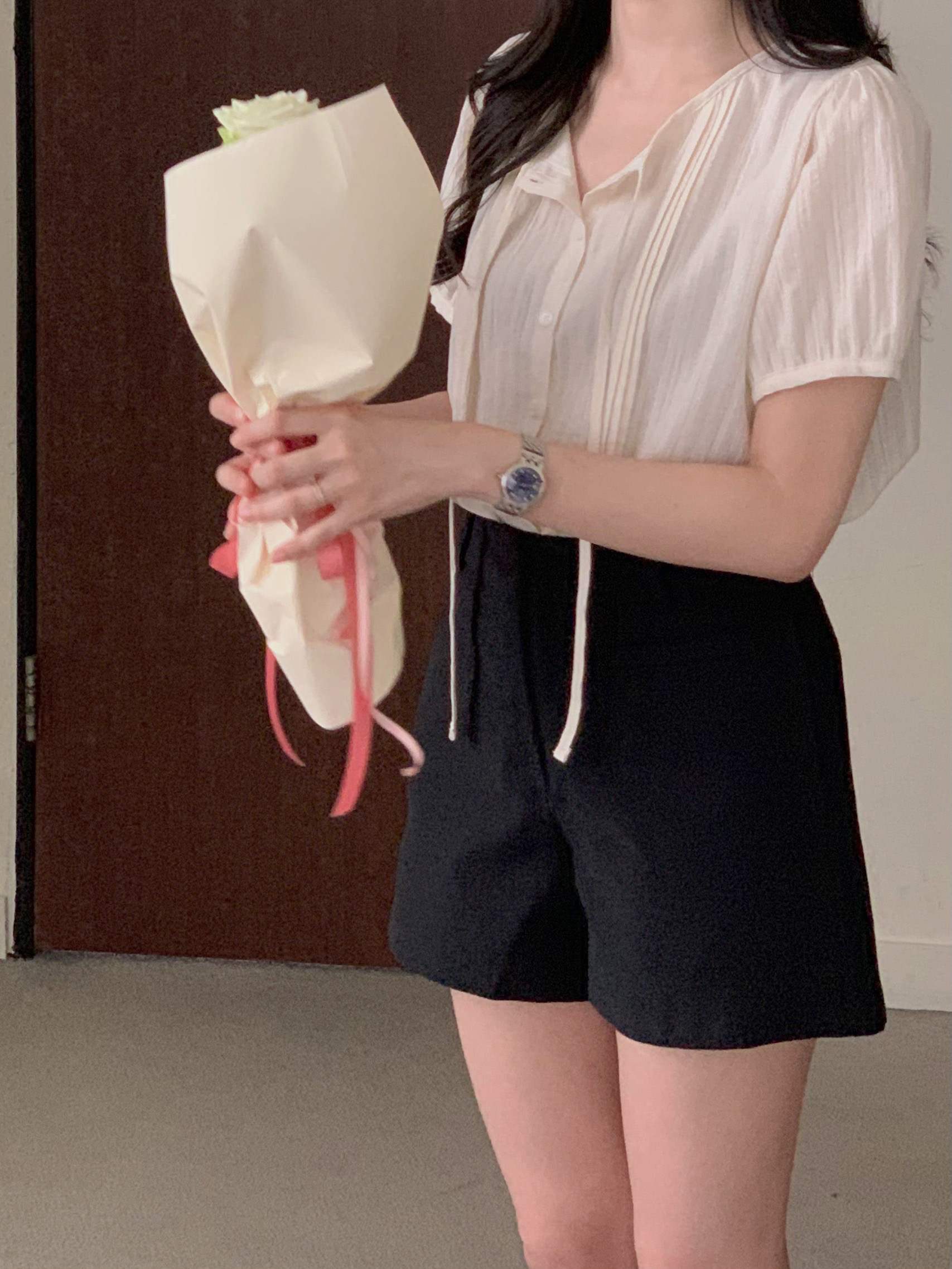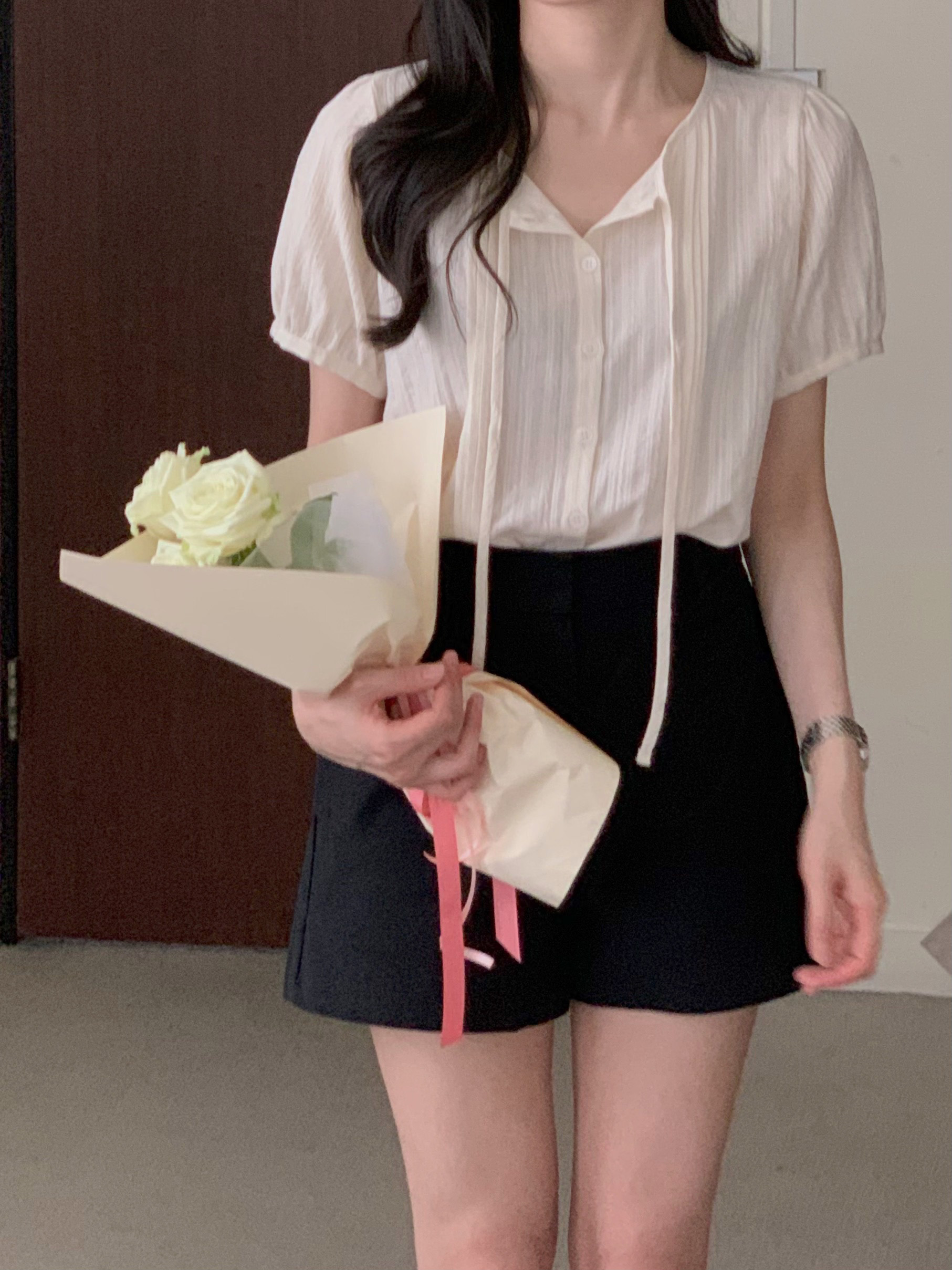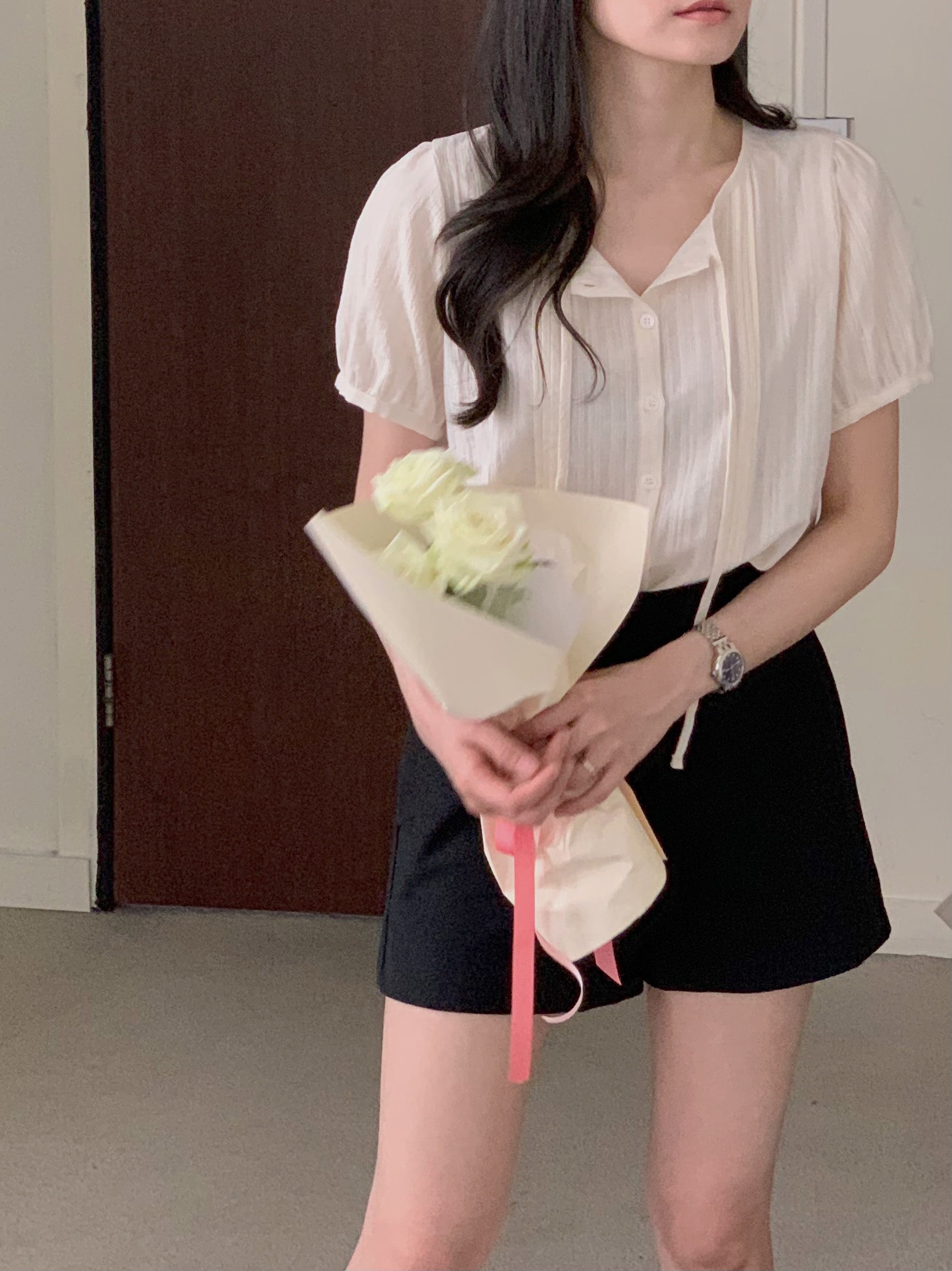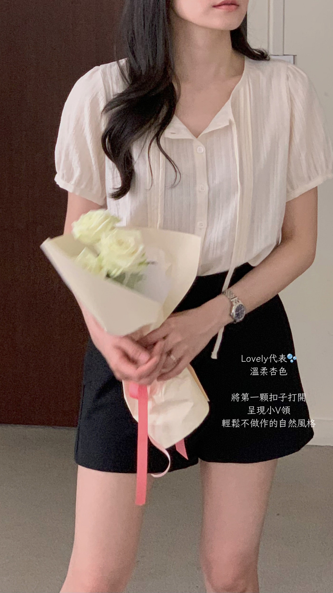 敞開小V領 x 全扣綁蝴蝶結 , 單穿不紮 x 紮進褲頭